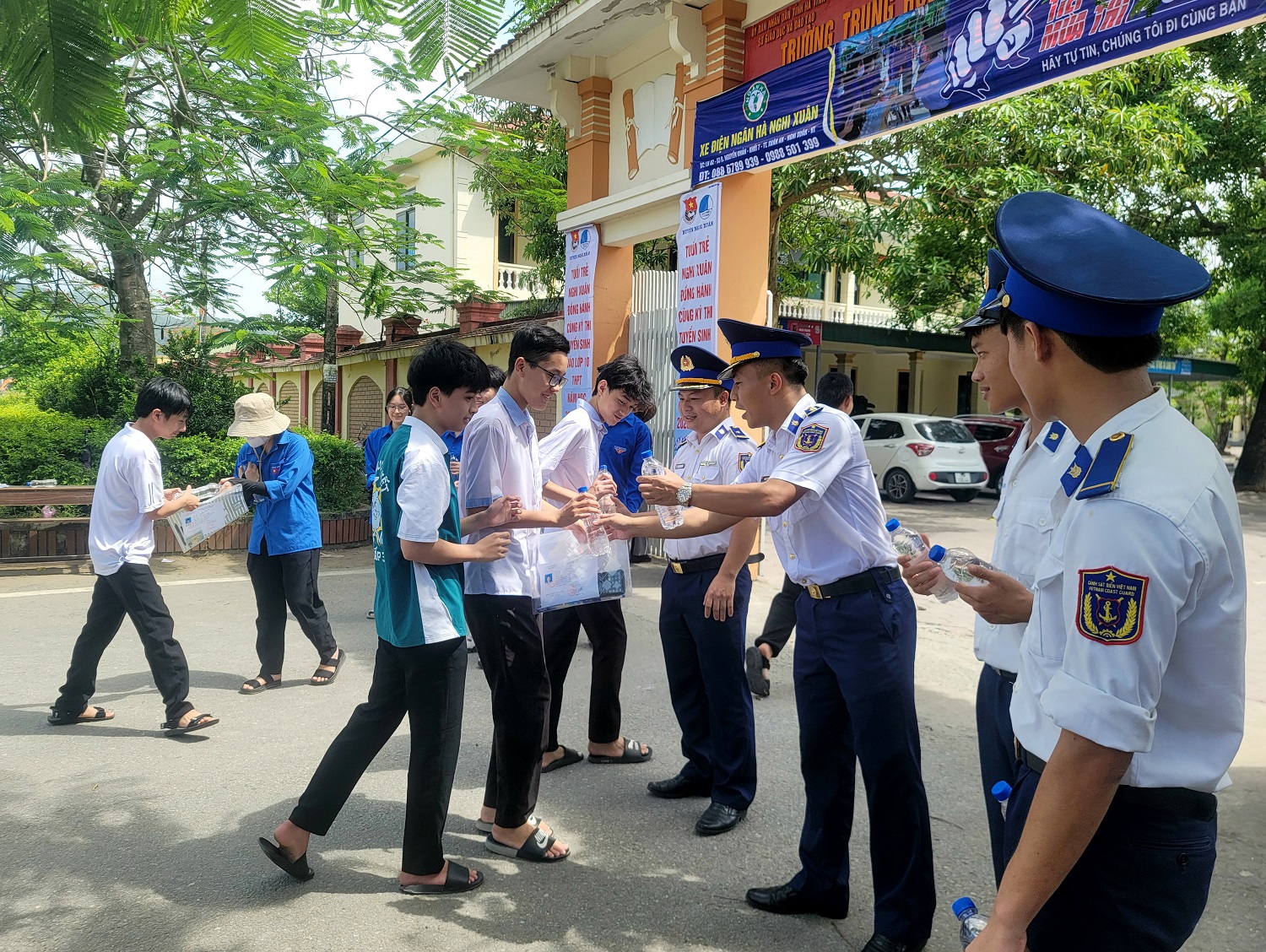 Trước đó, tại các điểm trường THPT Nguyễn Du, THPT Nguyễn Công Trứ và THPT Nghi Xuân (tỉnh Hà Tĩnh), Hải đội 102/Bộ Tư lệnh Vùng Cảnh sát biển 1 phối hợp với Huyện đoàn Nghi Xuân và các lực lượng vũ trang trên địa bàn tổ chức phân luồng giao thông, hỗ trợ trông giữ xe miễn phí, rà soát và bổ sung vật dụng cần thiết cho sĩ tử, cấp phát nước uống miễn phí, hướng dẫn sĩ tử vào phòng thi đúng giờ và động viên tinh thần để các sĩ tử bình tĩnh, tự tin bước vào kỳ thi quan trọng.