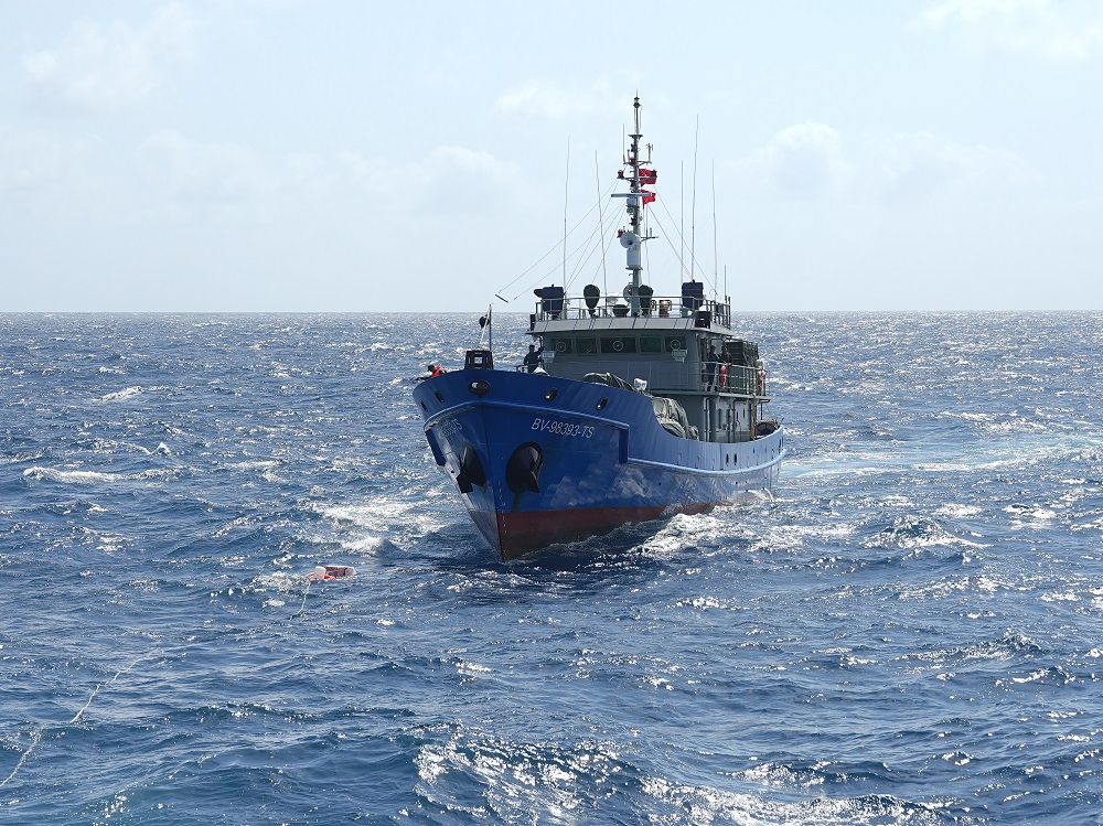 Do điều kiện sóng lớn, tàu dân quân thường trực BV 98393-TS nhận quà Tết qua dây thả trôi và chúc Tết qua bộ đàm.