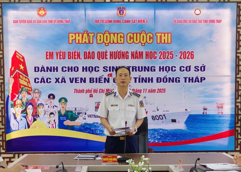 Ngày 10/11, tại phường Phước Thắng (thành phố Hồ Chí Minh), Bộ Tư lệnh Vùng Cảnh sát biển 3 phối hợp với Ban Tuyên giáo và Dân vận Tỉnh ủy Đồng Tháp; Sở Giáo dục và Đào tạo tỉnh Đồng Tháp tổ chức phát động Cuộc thi “Em yêu biển, đảo quê hương” năm học 2025 - 2026 dành cho hơn 7.300 học sinh thuộc 10 trường Trung học cơ sở các xã ven biển của tỉnh Đồng Tháp. Đại tá Nguyễn Trần Đông - Phó Tư lệnh Vùng Cảnh sát biển 3 chủ trì phát động.