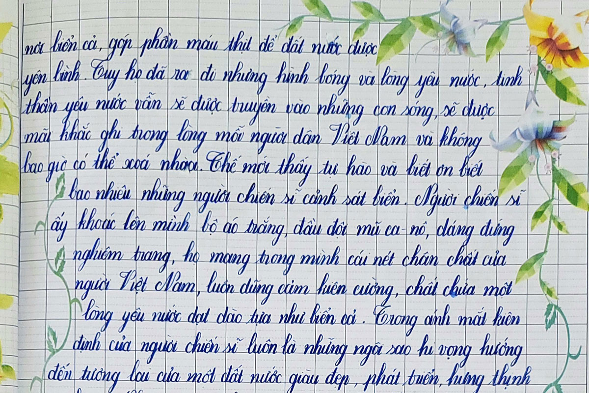 Song song với phần thi vẽ tranh, những bài viết cảm xúc về biển đảo và người chiến sĩ Cảnh sát biển do học sinh thể hiện cũng để lại nhiều ấn tượng sâu sắc với Ban Giám khảo. Các em trình bày bài viết một cách nắn nót, trang trí khéo léo bằng những họa tiết thủ công đầy sáng tạo. Trong từng câu chữ, tình yêu biển đảo, niềm tự hào về quê hương cùng lòng biết ơn và sự ngưỡng mộ dành cho người chiến sĩ Cảnh sát biển được thể hiện chân thành, hồn nhiên mà lay động.