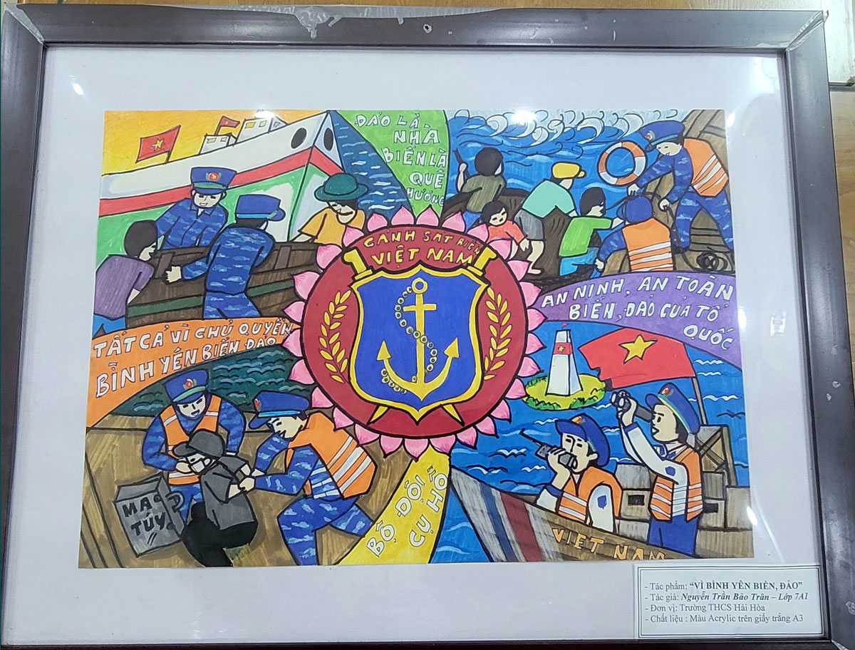 Tác phẩm tranh "Vì bình yên biển đảo" của em Nguyễn Trần Bảo Trân - Học sinh lớp 7A1, trường THCS Hải Hòa, tỉnh Nghệ An.