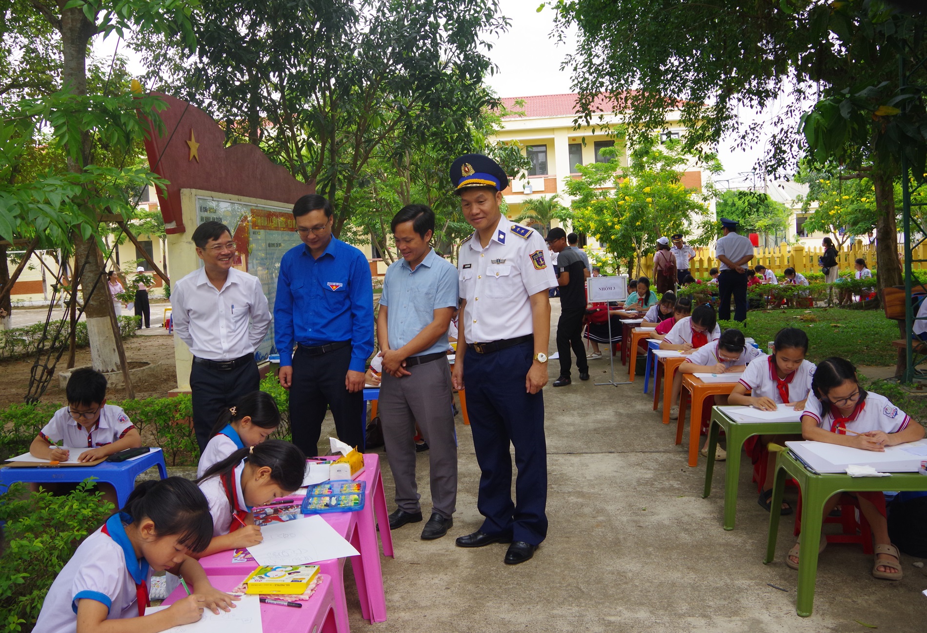 Trung tá Phan Hiếu Cường - Hải đội trưởng Hải đội 202 và các đại biểu xem các cháu vẽ tranh.