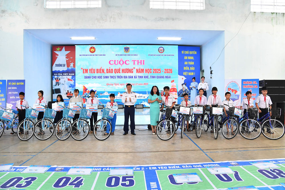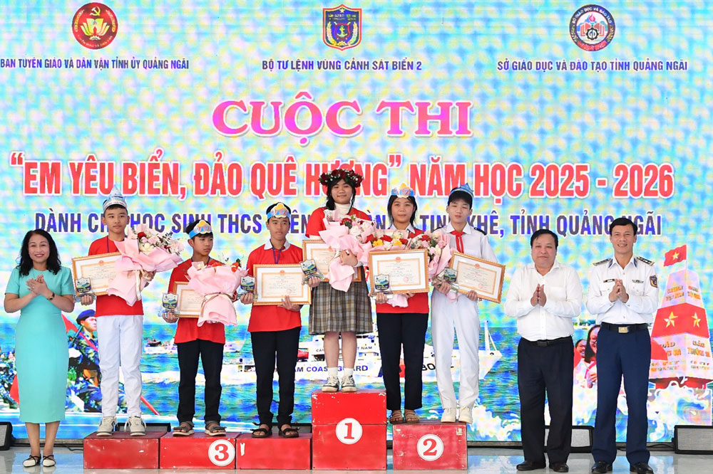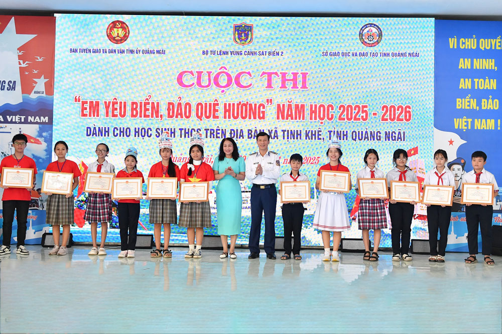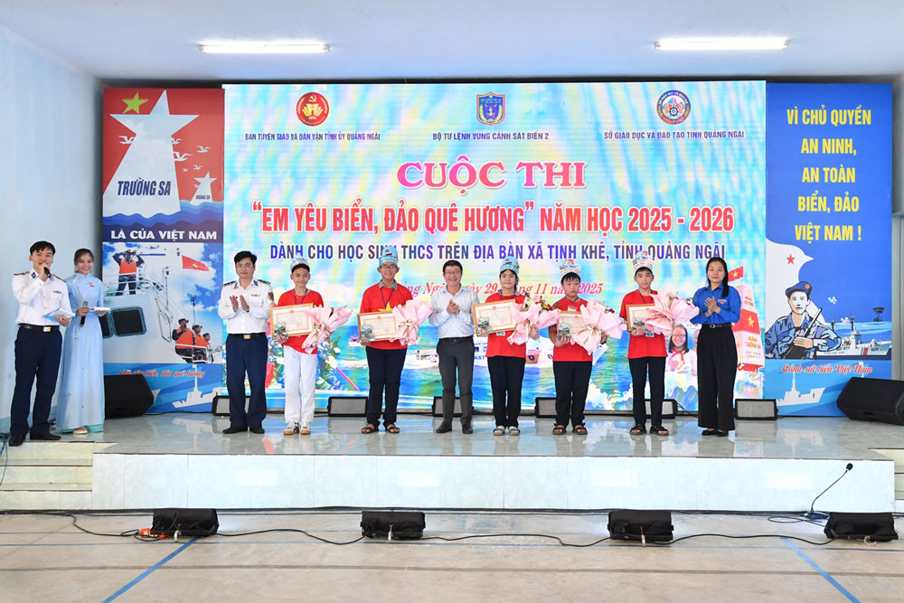 Ngày 29/11, Bộ Tư lệnh Vùng Cảnh sát biển 2 phối hợp với Ban Tuyên giáo và Dân vận Tỉnh ủy Quảng Ngãi, Sở giáo dục và đào tạo tỉnh Quảng Ngãi tổ chức Cuộc thi “Em yêu biển, đảo quê hương” năm học 2025 - 2026 dành cho học sinh 05 Trường THCS trên địa bàn xã Tịnh Khê, tỉnh Quảng Ngãi.