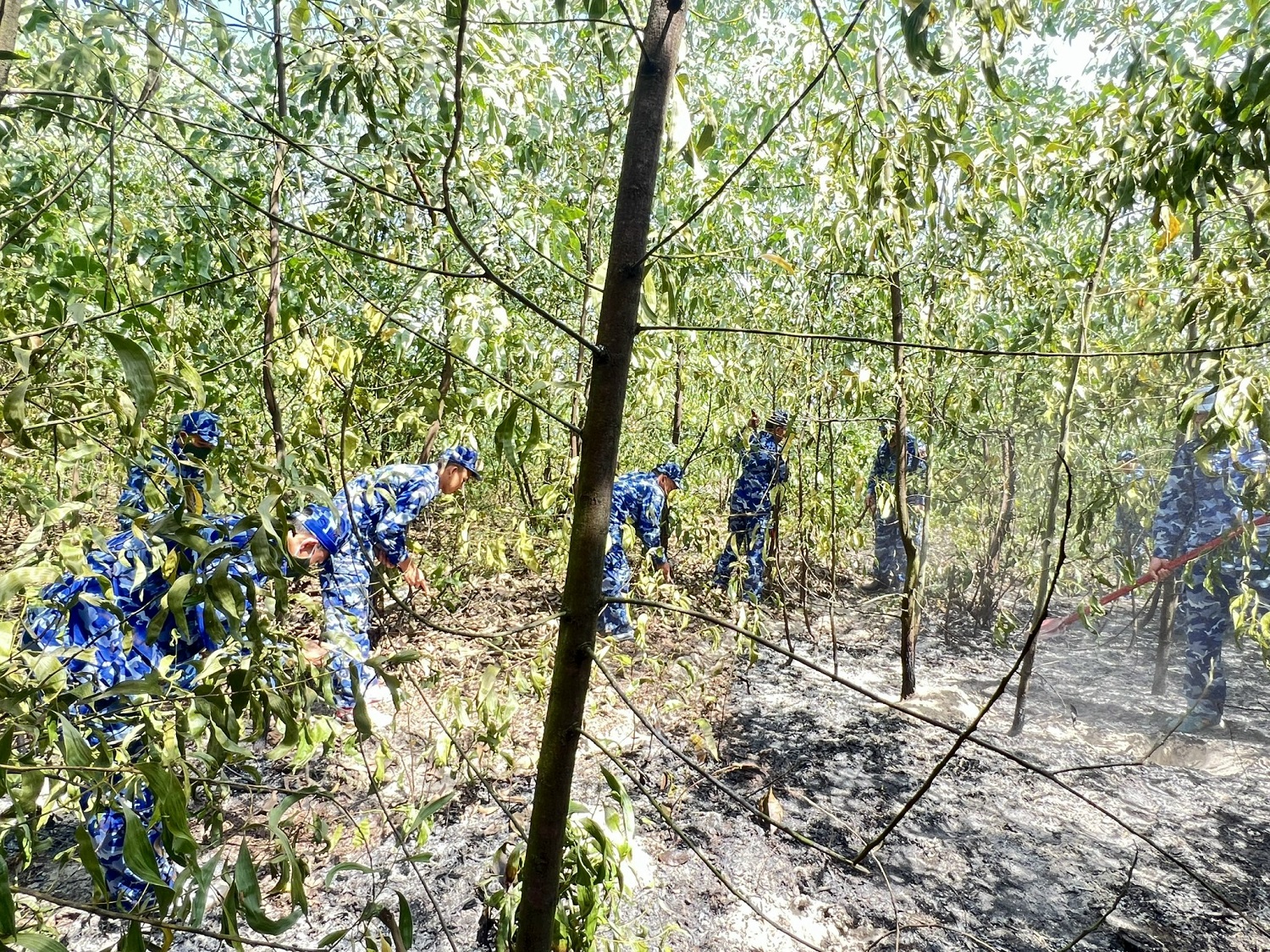 Do thời tiết khô nóng, gió thổi mạnh nên đám cháy lan nhanh, gây khó khăn trong quá trình tiếp cận hiện trường và dập tắt đám cháy. Để ngăn chặn đám cháy tiếp tục bùng phát và lan rộng, các lực lượng đã tích cực sử dụng phương tiện, dụng cụ được trang bị để khoanh vùng khu vực cháy và ngăn cách vật liệu cháy.