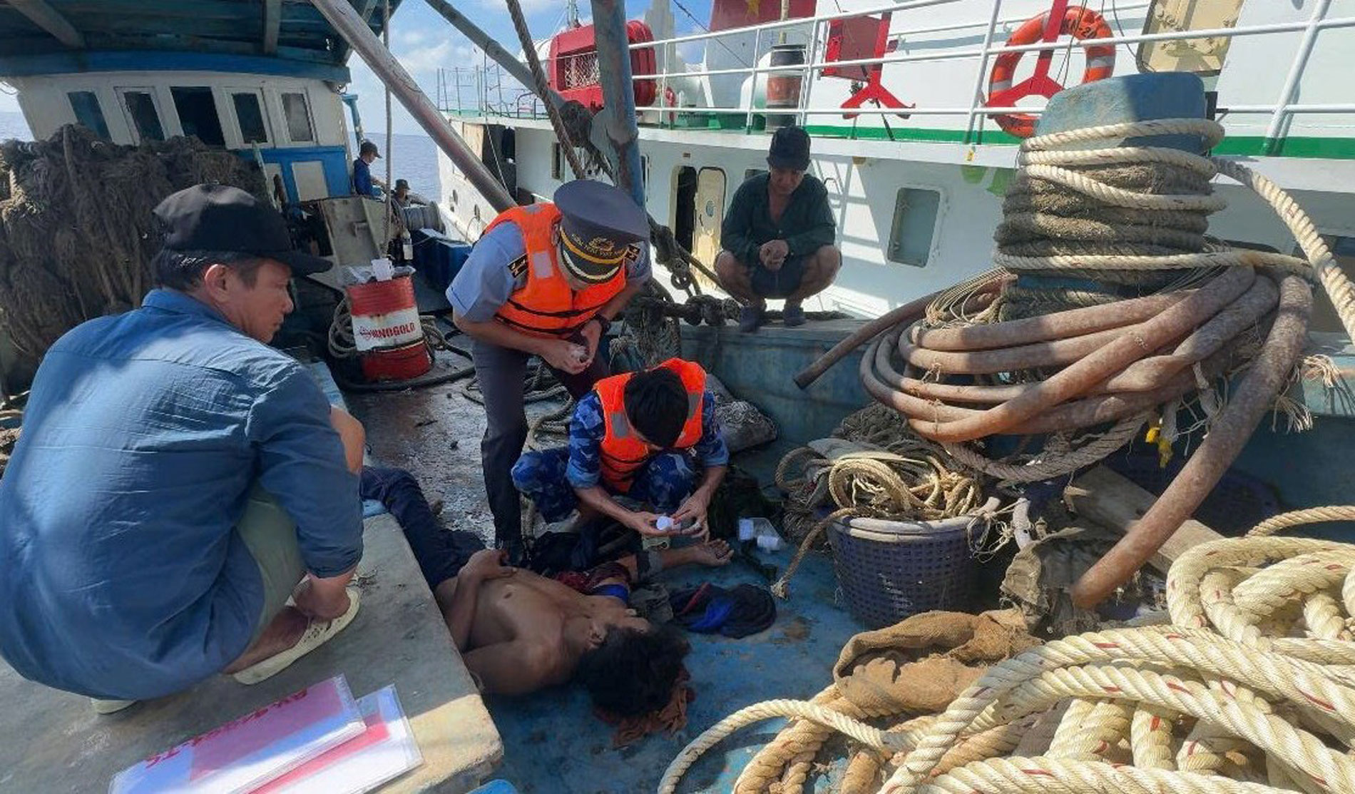 Tổ y tế đã khẩn trương tiến hành sơ cứu, băng bó vết thương, cho bệnh nhân uống thuốc theo chỉ dẫn và theo dõi sát tình trạng sức khỏe. Sau khi cấp phát thuốc và đảm bảo các biện pháp sơ cứu ban đầu, tổ quân y đã bàn giao bệnh nhân lại cho tàu cá, đồng thời hướng dẫn thuyền trưởng nhanh chóng đưa ngư dân vào bờ để tiếp tục điều trị, bảo đảm an toàn tính mạng.
