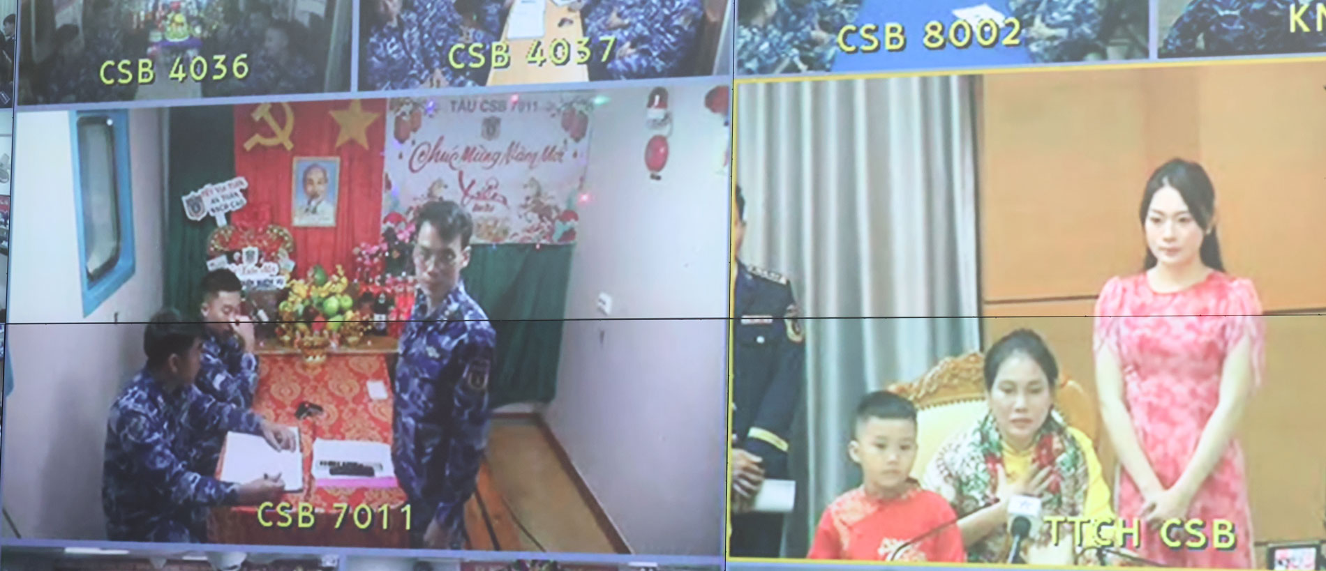 Đặc biệt, phía sau những người lính Cảnh sát biển đang ngày đêm kiên cường bám biển là những người mẹ tần tảo, người vợ thủy chung son sắt, những đúa con ngoan ở đất liền. Vào khoảnh khắc thiêng liêng chuyển mình của năm cũ, tại trung tâm chỉ huy Cảnh sát biển, có sự xuất hiện của mẹ đẻ đồng chí Thượng úy QNCN Nguyễn Tiến Thành - Nhân viên Radar tàu CSB 7011 (Thành mồ côi bố từ nhỏ, một mình mẹ Thành nuôi dạy 3 anh em trưởng thành). Năm nay, Thành thực hiện nhiệm vụ trực trên biển nên không thể về quê đón Tết sum vầy cùng gia đình. Qua hệ thống Visat, mẹ đồng chí Thành đã gửi lời chúc mừng năm mới đến đồng đội của con trai mình và chúc Thành luôn mạnh khỏe, cố gắng hoàn thành nhiệm vụ. “Ở nhà và gia đình vẫn khỏe, con yên tâm công tác. Mẹ tự hào về con - mẹ Thành nói trong niềm xúc động”.