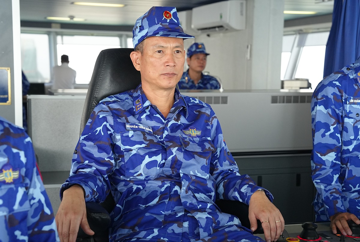 Đại tá Nguyễn Trần Đông theo dõi và chỉ huy luyện tập trên tàu CSB 8001.