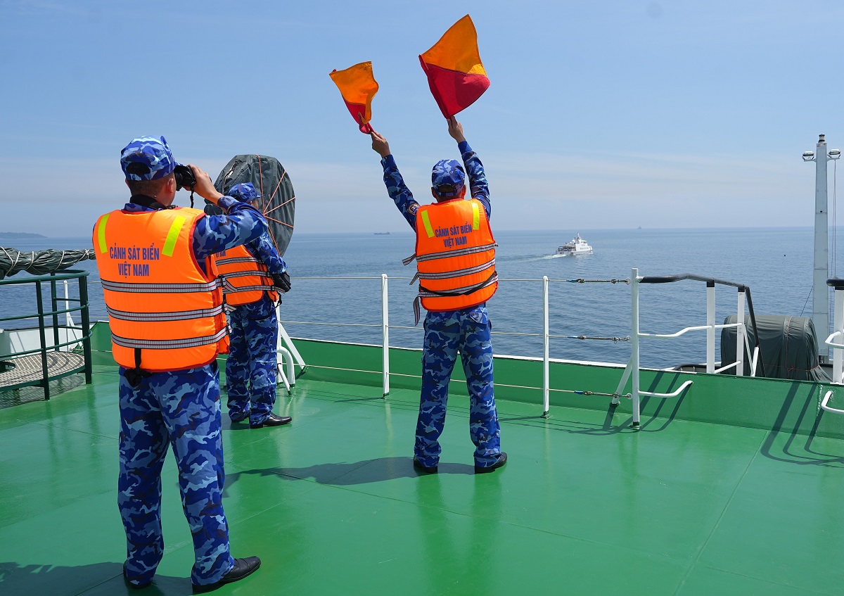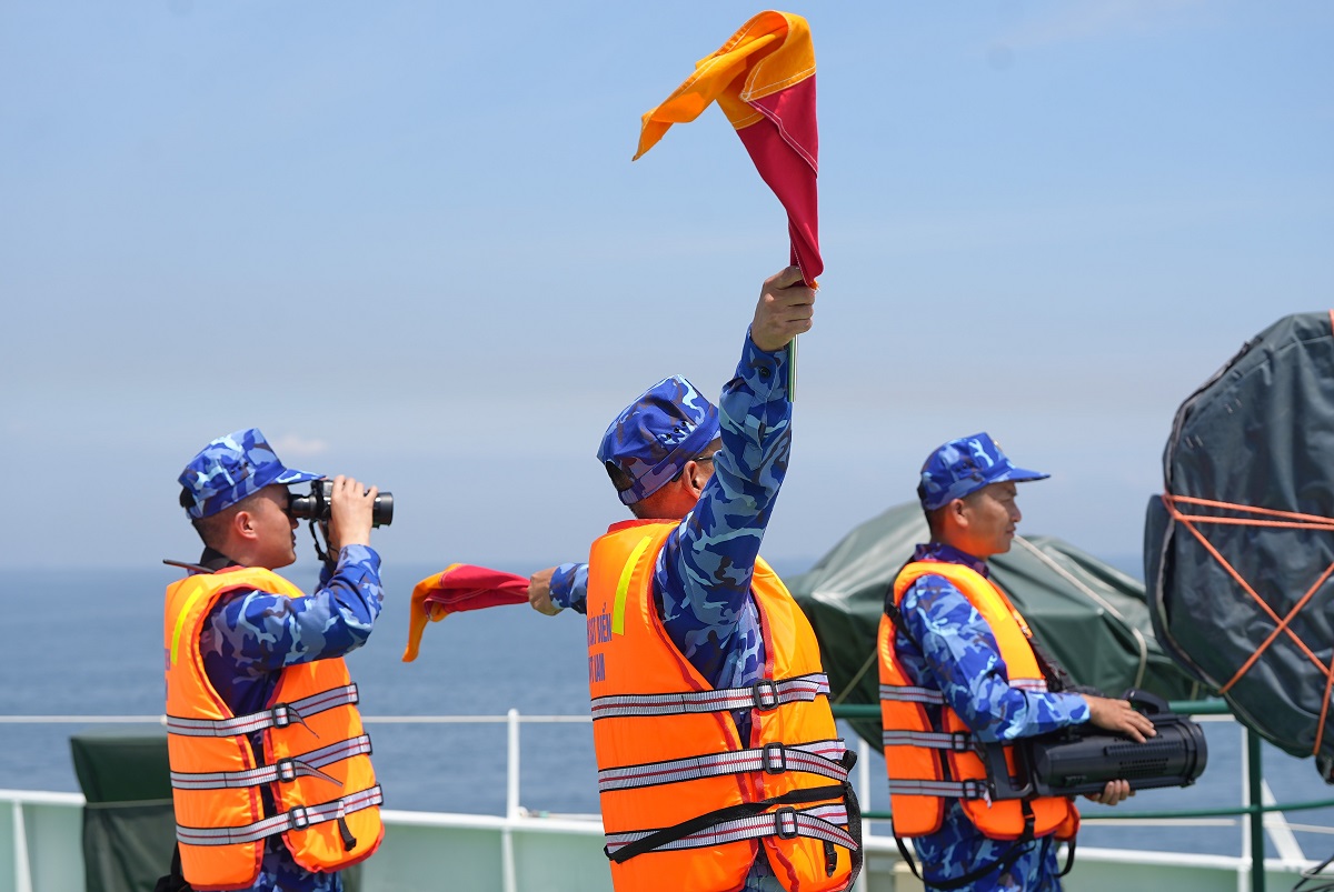 Đối với nội dung triển khai lực lượng và di chuyển theo đội hình trên biển, thực hiện kế hoạch hai Bên thống nhất trước đó, hai tàu tiến hành di chuyển theo hướng và tốc độ đã xác định. Vị trí và khoảng cách hai tàu được thay đổi linh hoạt, đáp ứng tốt yêu cầu của tình huống khẩn cấp giả định đặt ra.