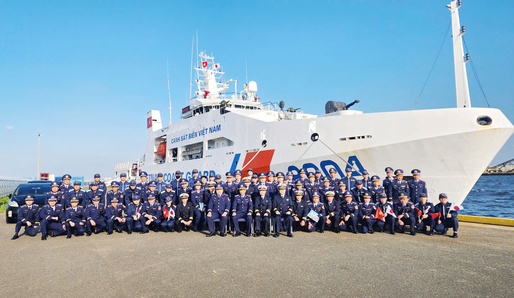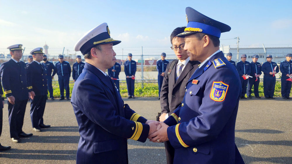 Lực lượng thực thi pháp luật trên biển hai nước chụp ảnh lưu niệm trước lúc tàu CSB 8004 rời cảng Hakata.