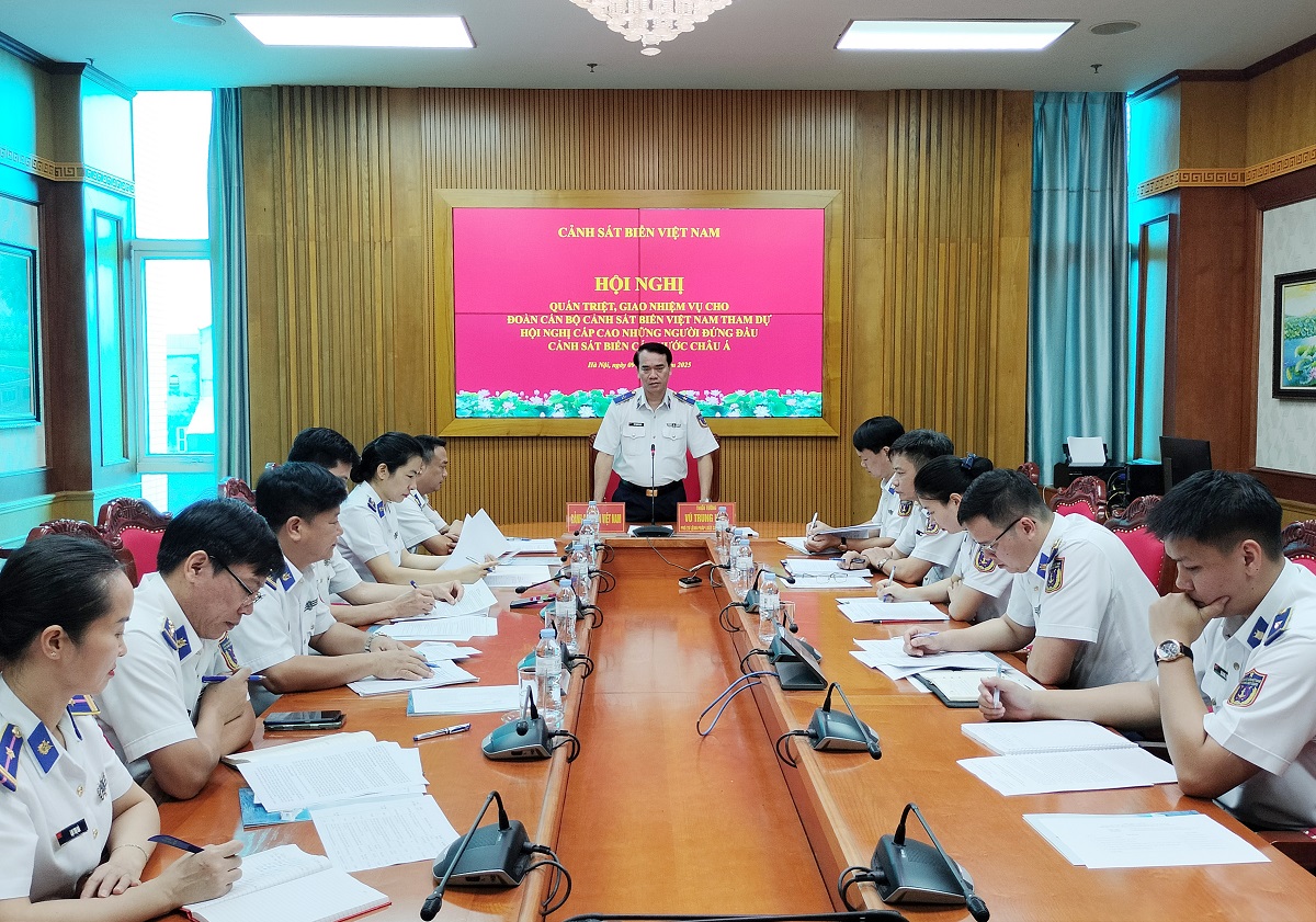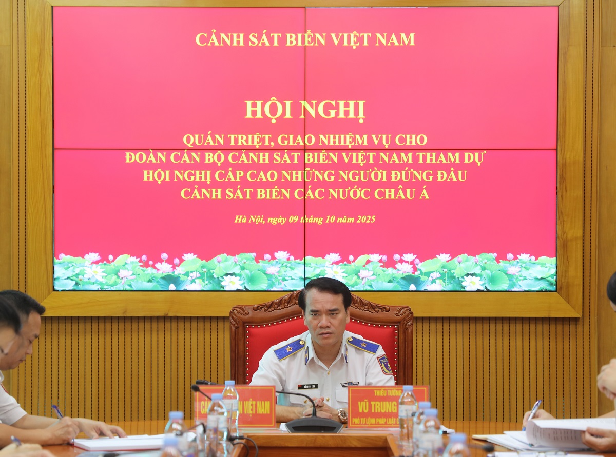 Sáng 9/10, Cảnh sát biển Việt Nam tổ chức Hội nghị quán triệt, giao nhiệm vụ cho đoàn công tác Cảnh sát biển Việt Nam tham dự Hội nghị cấp cao những người đứng đầu Cảnh sát biển các nước Châu Á lần thứ 21 (HACGAM - 21). Thiếu tướng Vũ Trung Kiên - Phó Tư lệnh Pháp luật Cảnh sát biển Việt Nam chủ trì Hội nghị và phát biểu giao nhiệm vụ cho đoàn công tác.