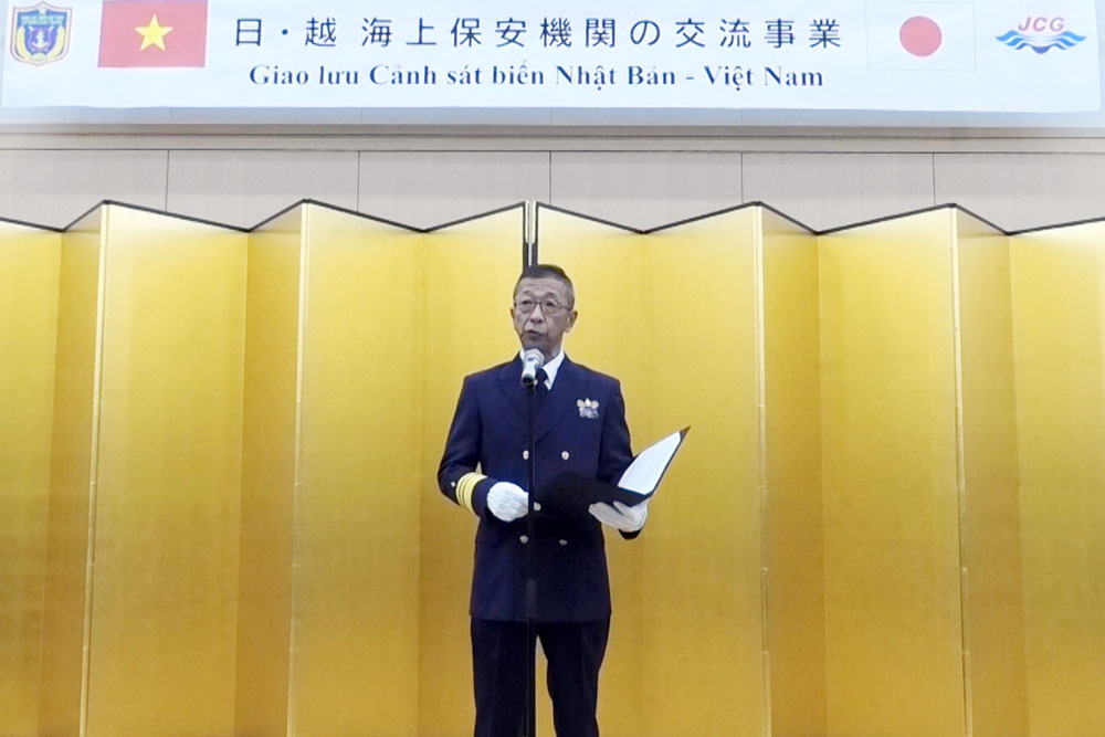 Ngài Fukumoto Takuya - Tư lệnh Vùng 7, Lực lượng Bảo vệ bờ biển Nhật Bản phát biểu tại lễ đón tàu CSB 8004.