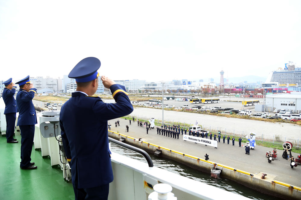 Lực lượng Bảo vệ bờ biển Nhật Bản chào đón tàu CSB 8004 cập cảng Hakata, thành phố Fukuoka.