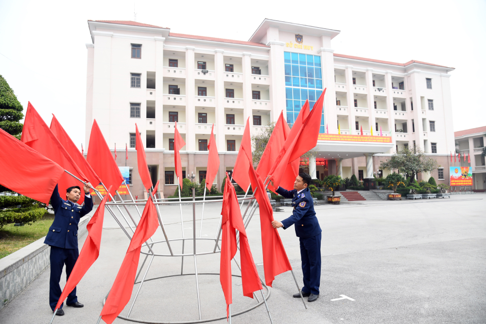 Cổ động trực quan thông qua trưng bày hệ thống cờ Đảng, cờ Tổ quốc, pa-nô, áp-phích... thể hiện nội dung hướng về Đại hội tại BTL Vùng Cảnh sát biển 1.