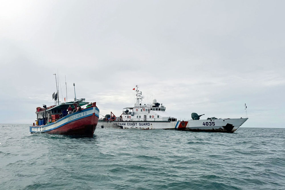 Tàu CSB 4035/ Hải đội 422/ Hải đoàn 42/ BTL Vùng Cảnh sát biển 4 đang thực hiện nhiệm vụ chống IUU trên biển. Ảnh: Vùng CSB 4