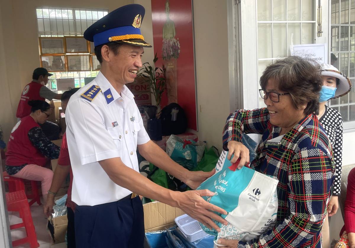 Đại tá Lê Văn Tú - Chính ủy Bộ Tư lệnh Vùng Cảnh sát biển 3 trao quà cho nhân dân khi đến khám bệnh.