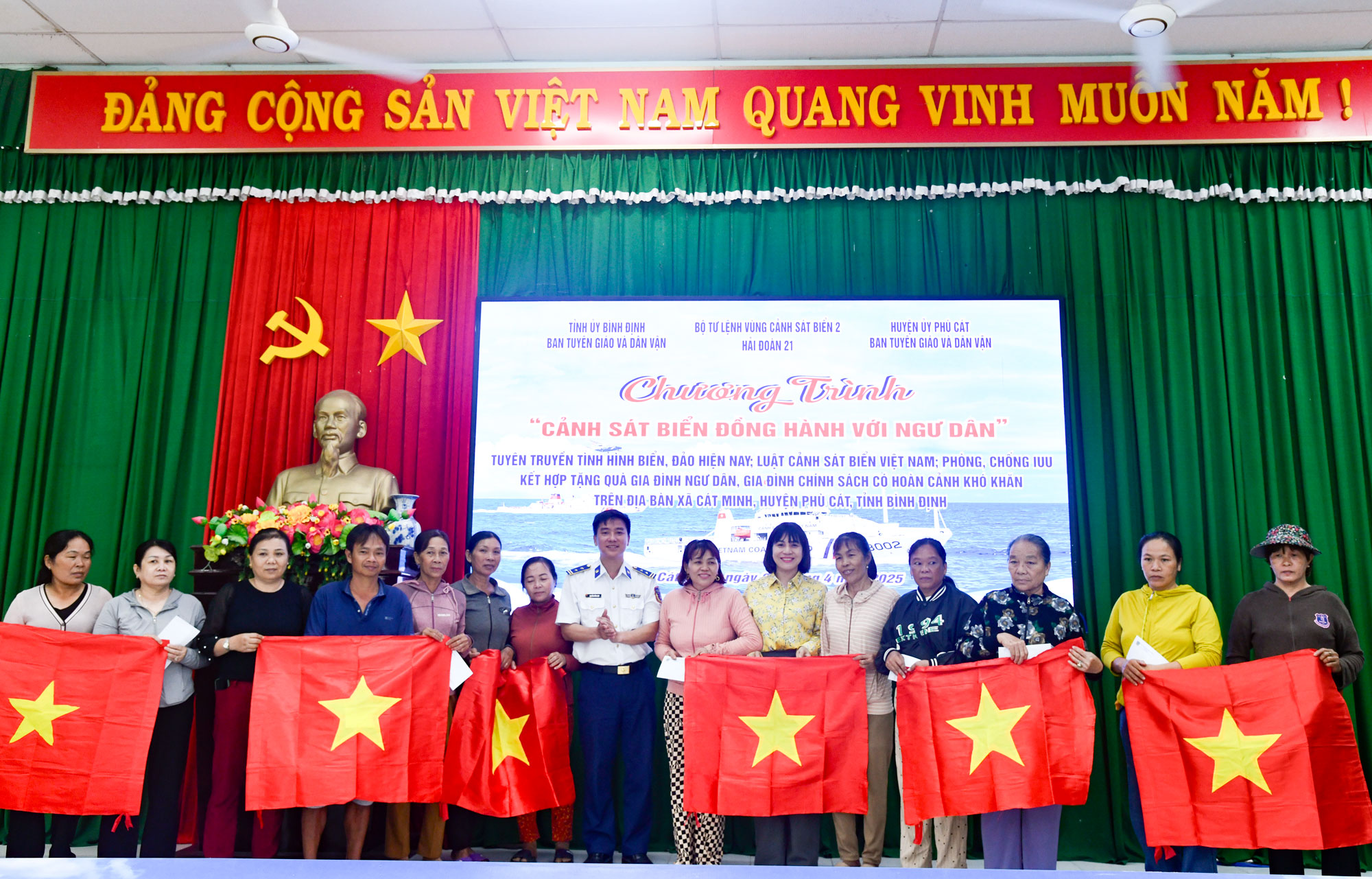 Sáng 26/4, Hải đoàn 21, Bộ Tư lệnh Vùng Cảnh sát biển 2 phối hợp với Ban Tuyên giáo và Dân vận Tỉnh ủy Bình Định, Huyện ủy Phù Cát tổ chức Hội nghị tuyên truyền về tình hình biển, đảo; Luật Cảnh sát biển Việt Nam; phòng, chống IUU kết hợp tặng quà gia đình ngư dân, gia đình chính sách có hoàn cảnh khó khăn trên địa bàn xã Cát Minh, huyện Phù Cát, tỉnh Bình Định.