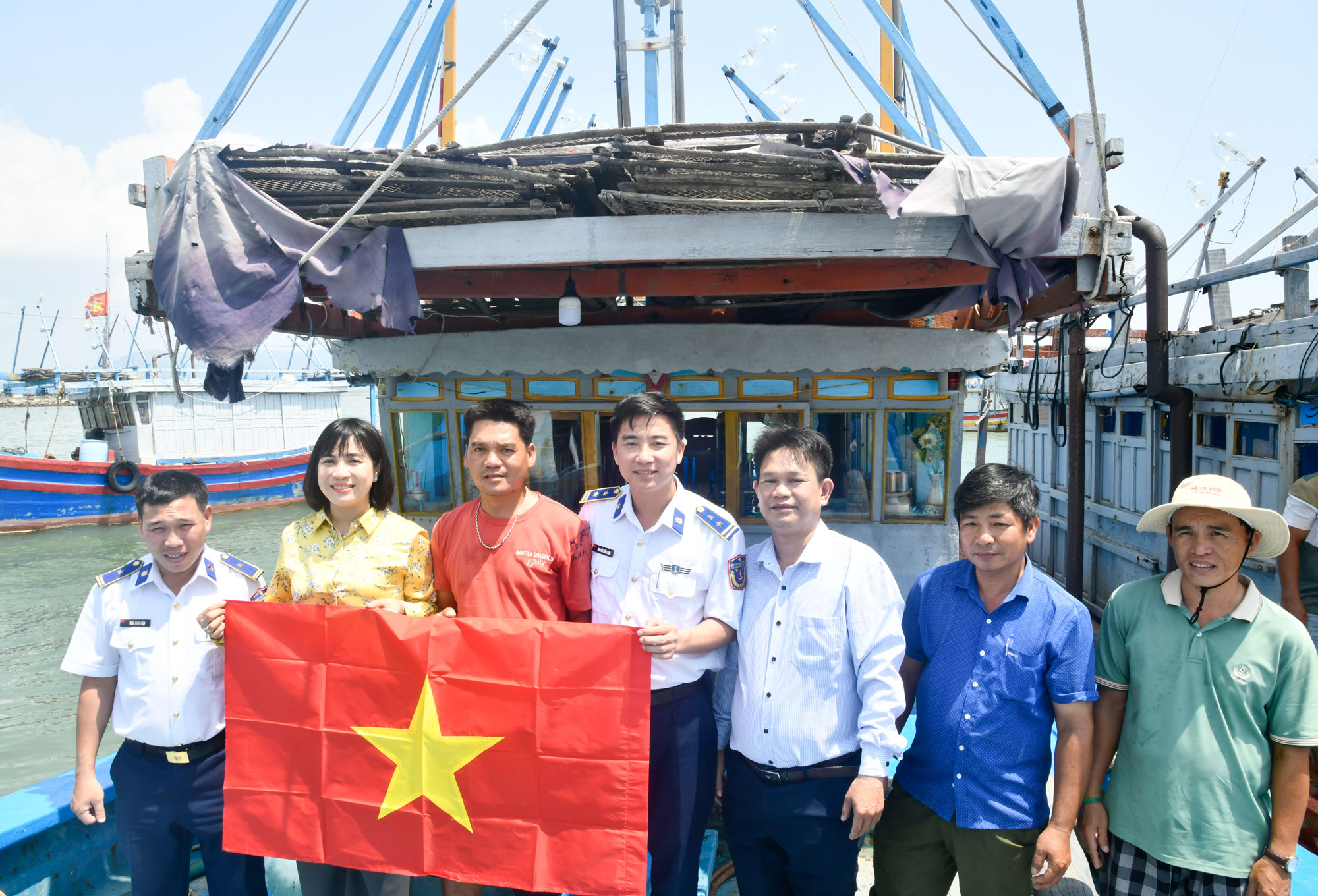 Đại diện Hải đoàn 21 và Ban Tuyên giáo và Dân vận tỉnh ủy Bình Định trao quà và cờ Tổ quốc cho bà con ngư dân.