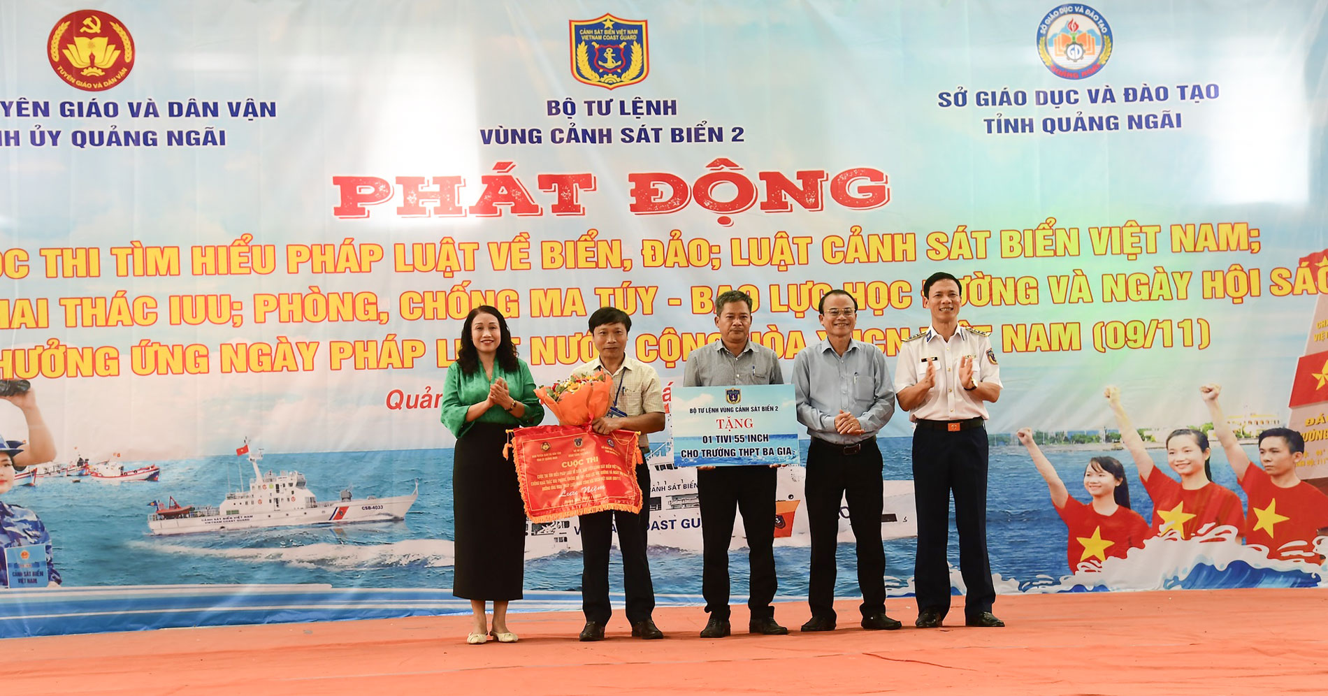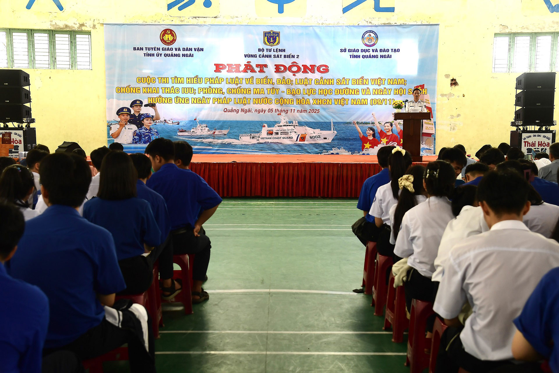 Chiều 5/11, tại xã Ba Gia, tỉnh Quảng Ngãi, Bộ Tư lệnh Vùng Cảnh sát biển 2 phối hợp với Ban Tuyên giáo và Dân vận Tỉnh ủy Quảng Ngãi, Sở Giáo dục và đạo tạo tỉnh Quảng Ngãi phát động Cuộc thi tìm hiểu pháp luật về biển, đảo; Luật Cảnh sát biển; chống khai thác IUU; Luật phòng, chống ma túy và Ngày hội sách năm 2025 với sự tham gia của hơn 1.500 học sinh Trường THPT Ba Gia.