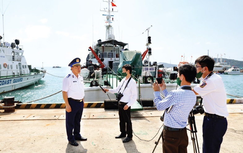 Phóng viên các cơ quan báo chí tác nghiệp đưa tin về hoạt động của Lực lượng Cảnh sát biển. Ảnh: Liên Nhi
