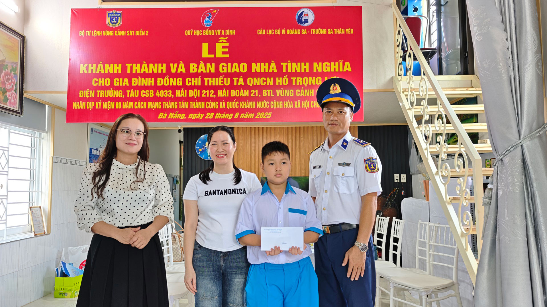 Cùng với đó, tại thôn Thanh Trà, xã Núi Thành, thành phố Đà Nẵng ngôi nhà ở của gia đình Thiếu tá QNCN Hồ Trọng Lợi - Điện trưởng tàu CSB 4033/Hải đội 212/Hải đoàn 21/Bộ Tư lệnh Vùng Cảnh sát biển 2 được khởi công sửa chữa từ tháng 6/2025, đến nay ngôi nhà đã hoàn thành theo đúng kế hoạch, bảo đảm chất lượng. Tổng giá trị của công trình là gần 150 triệu đồng, do vợ chồng đồng chí Lợi tích góp, tiết kiệm và sự hỗ trợ, giúp đỡ của gia đình; trong đó có 80 triệu đồng do Quỹ học bổng Vừ A Dính, Câu lạc bộ “Vì Hoàng Sa - Trường Sa thân yêu” và gia đình ông Ngô Hà Bắc, bà Nguyễn Việt Triều hỗ trợ.