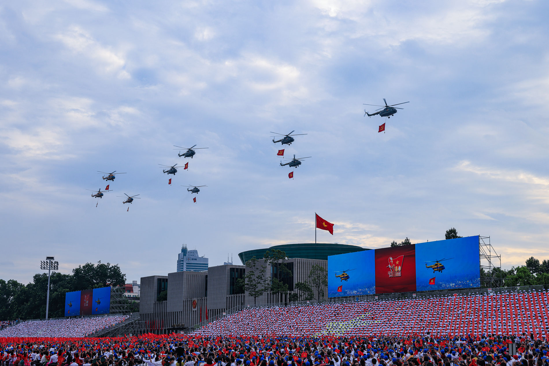 Đúng 6 giờ 45 phút, tại Sân vận động quốc gia Mỹ Đình, cán bộ, chiến sĩ Lữ đoàn Pháo binh 45 khai hỏa 21 phát đại bác rền vang trên nền Quốc thiều nước Cộng hòa xã hội chủ nghĩa Việt Nam.