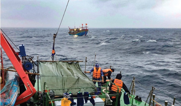 Lực lượng Cảnh sát biển cứu kéo tàu cá bị nạn trên vùng biển tỉnh Nghệ An. Ảnh: Lam Giang