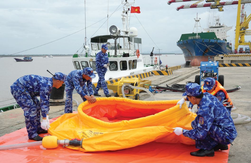 Lực lượng Cảnh sát biển huấn luyện sử dụng thiết bị xử lý sự cố tràn dầu trên cảng.