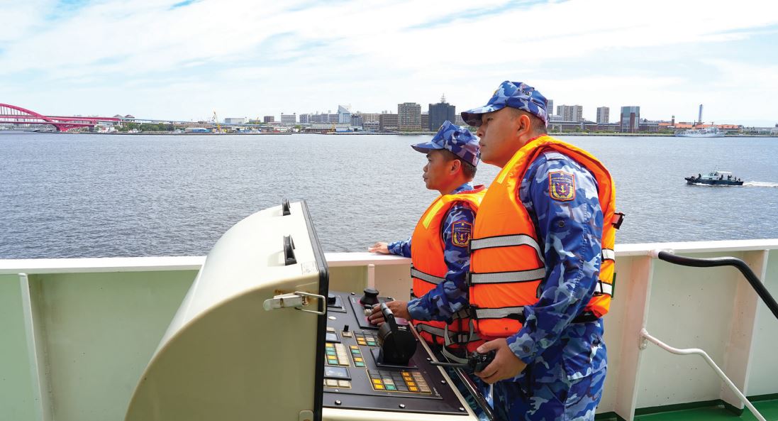 Sĩ quan hàng hải điều khiển tàu Cảnh sát biển cập cảng bằng hệ thống lái tàu ngoài boong.
