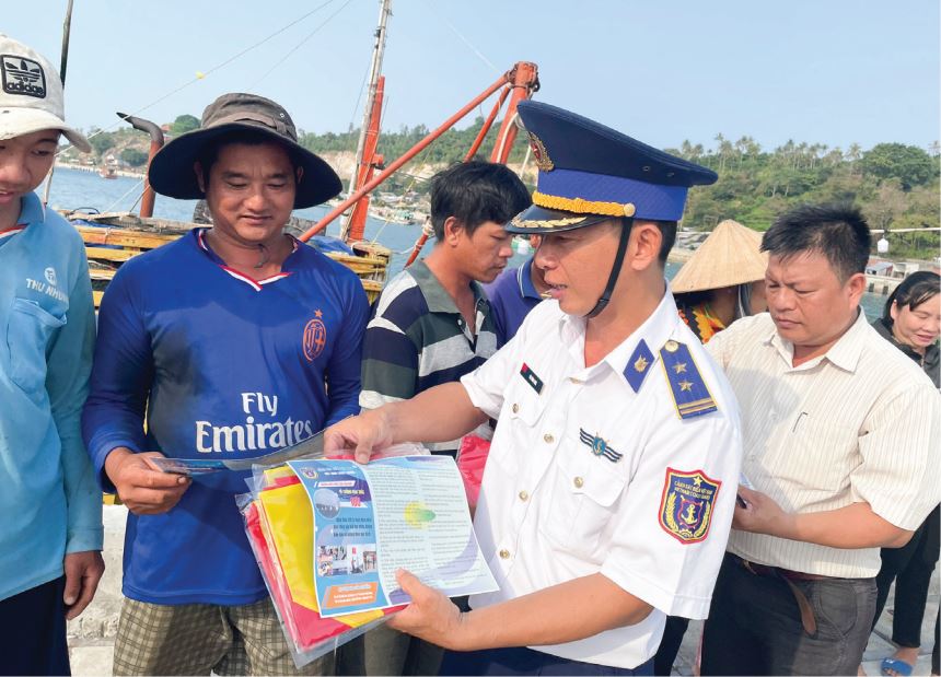 Trung tá Vũ Đình Ngà phát tờ rơi tuyên truyền phòng chống IUU cho ngư dân.