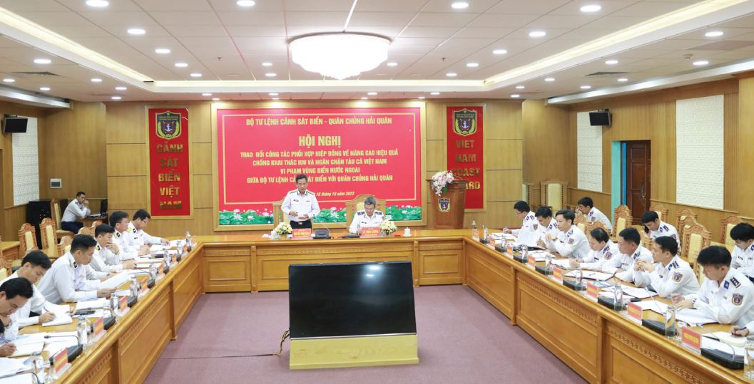 Hội nghị trao đổi công tác phối hợp hiệp đồng về nâng cao hiệu quả chống khai thác IUU và ngăn chặn tàu cá Việt Nam vi phạm vùng biển nước ngoài giữa Bộ Tư lệnh Cảnh sát biển với Quân chủng Hải quân.