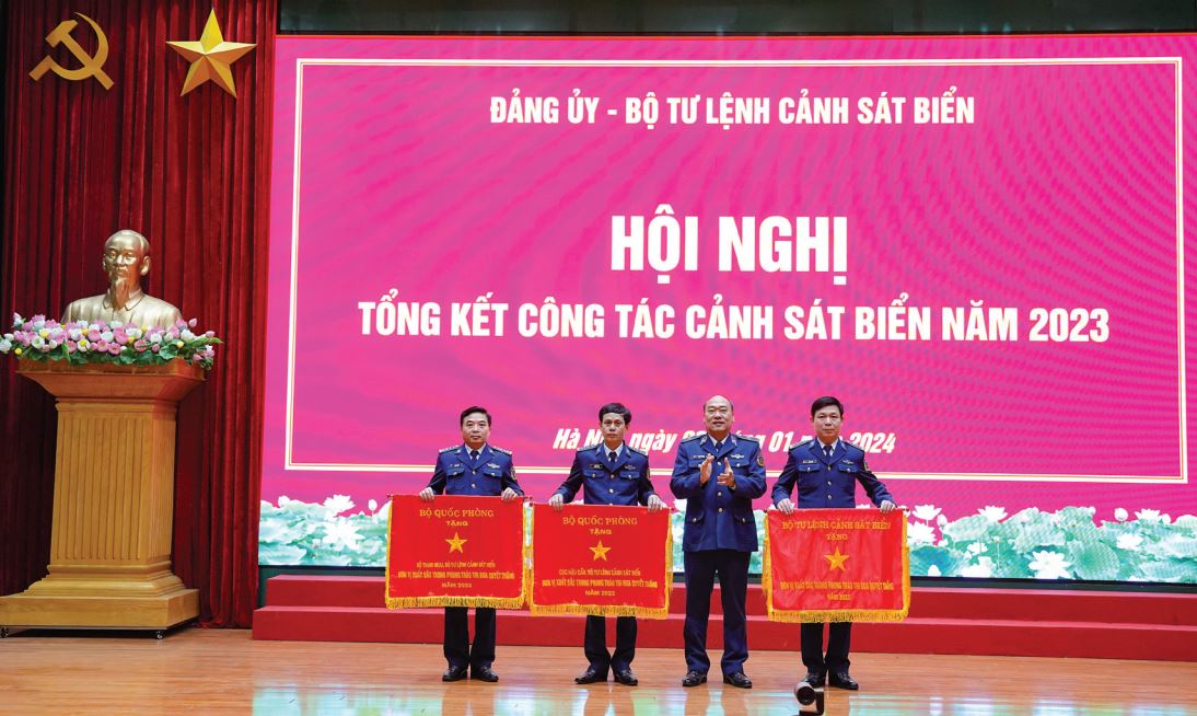 Thiếu tướng Lê Quang Đạo - Tư lệnh Cảnh sát biển trao Cờ Thi đua của Bộ Quốc phòng, Bộ Tư lệnh Cảnh sát biển cho các Đơn vị xuất sắc trong phong trào Thi đua Quyết thắng năm 2023.