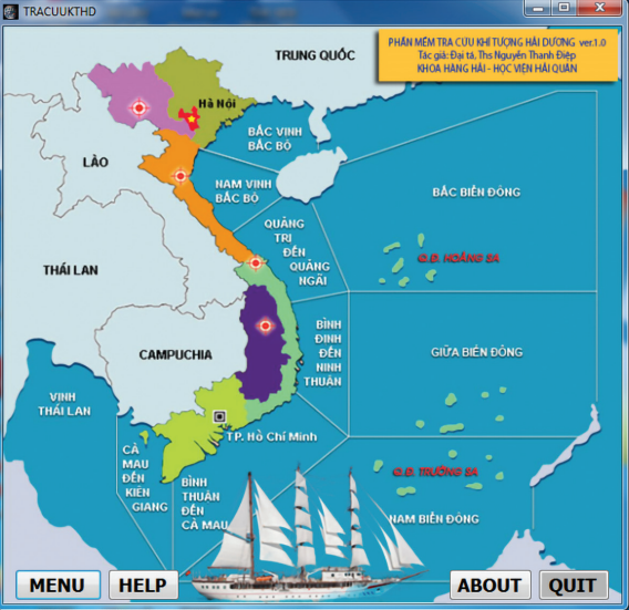 Để xây dựng phần mềm “Tra cứu khí tượng hải dương”, trước hết chúng tôi đã tìm tòi, thu thập gần 200 bản đồ, sơ đồ từ nhiều tài liệu, ấn phẩm, atlas các yếu tố KTHD từ các cơ quan chuyên môn của Quân chủng Hải quân và cơ quan khí tượng thủy văn Quốc gia. Các bản đồ, sơ đồ bao gồm: địa hình, chất đáy; các yếu tố khí tượng trong từng tháng trên Biển Đông như: chế độ gió, đường đi trung bình và tần suất xuất hiện bão, nhiệt độ không khí trung bình, thời gian mưa, lượng mưa, số ngày giông; các yếu tố hải dương như: sóng biển, dòng chảy, vết đi, thuỷ triều và nước dâng trong bão; một số đặc trưng môi trường biển như: nhiệt độ nước biển, độ muối, độ trong suốt, màu nước biển. Trong đó, các số liệu trung bình nhiều năm, từng tháng hoặc từng mùa của mỗi yếu tố được trình bày dưới dạng sơ đồ,…