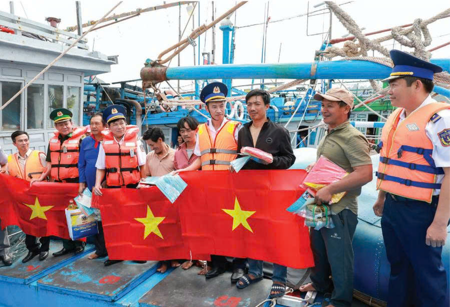 Bộ Tư lệnh Vùng Cảnh sát biển 3 tuyên truyền pháp luật, tặng cờ Tổ quốc cho ngư dân. Ảnh: Đức Hạnh