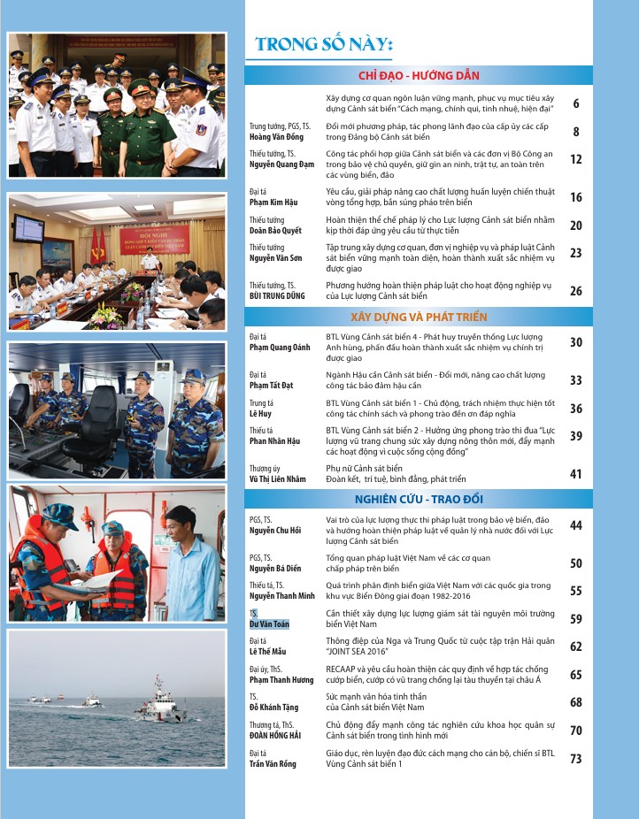 Một số bài viết tiêu biểu đã đăng trong Tạp chí Cảnh sát biển Việt Nam số 1 như: "Vai trò của lực lượng thực thi pháp luật trong bảo vệ biển, đảo và hướng hoàn thiện pháp luật về quản lý nhà nước đối với Lực lượng Cảnh sát biển" của PGS, TS. Nguyễn Chu Hồi; "Tổng quan pháp luật Việt Nam về các cơ quan chấp pháp trên biển" của PGS, TS. Nguyễn Bá Diến; "Cần thiết xây dựng lực lượng giám sát tài nguyên môi trường biển Việt Nam” của S. Dư Văn Toán....