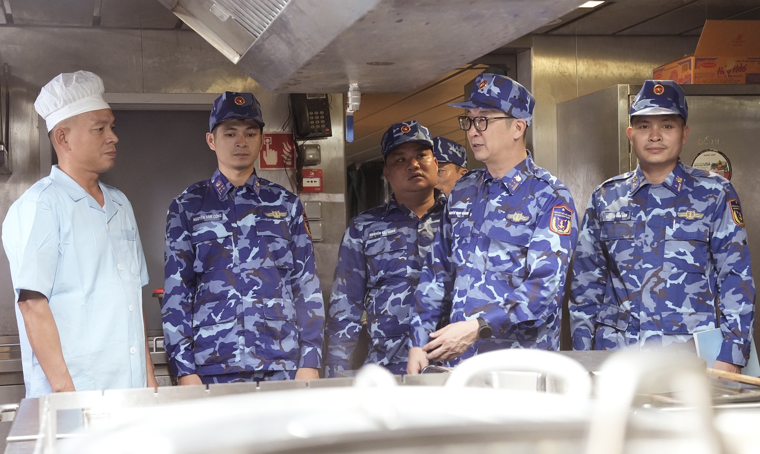 Đại tá Nguyễn Minh Khánh - Phó Tư lệnh, Tham mưu trưởng Bộ Tư lệnh Vùng Cảnh sát biển 3 thăm hỏi, động viên các “anh nuôi”.