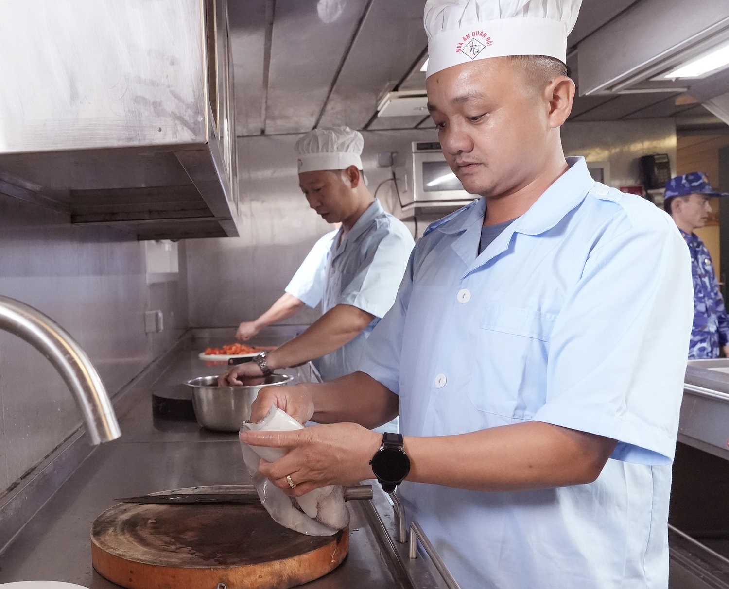 Đang say sưa chế biến món thịt kho trên chảo nhưng Đại úy QNCN Phan Văn Trung vẫn dành thời gian chia sẻ với tôi: “Là người trực tiếp chuẩn bị các bữa ăn hàng ngày cho tập thể tàu thực hiện nhiệm vụ, chúng tôi luôn quan tâm đến từng khẩu phần ăn, từng thói quen ăn uống của các thành viên trên tàu. Việc chế biến món ăn ngon và đẹp mắt đã trở thành thói quen của chúng tôi, nhưng bên cạnh đó đội ngũ nhà bếp chúng tôi còn cố gắng sắp xếp thời gian sao cho món ăn khi lên mâm phải còn nóng hổi, chế độ ăn phải đầy đủ chất dinh dưỡng và bữa ăn phải phù hợp với điều kiện sức khỏe và khẩu vị của từng người”.