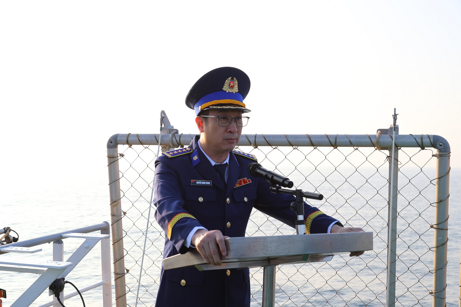 Đúng 7 giờ 30 phút, Đại tá Nguyễn Minh Khánh - Phó Tư lệnh, Tham mưu trưởng Bộ tư lệnh Vùng Cảnh sát biển 3, Trưởng đoàn công tác Cảnh sát biển Việt Nam hô khẩu lệnh: “Chào cờ...Chào!”, cả con tàu dường như "nín thở", dành lại không gian cho tiếng sóng vỗ vào thân tàu và tiếng Quốc ca vang lên hùng hồn.
