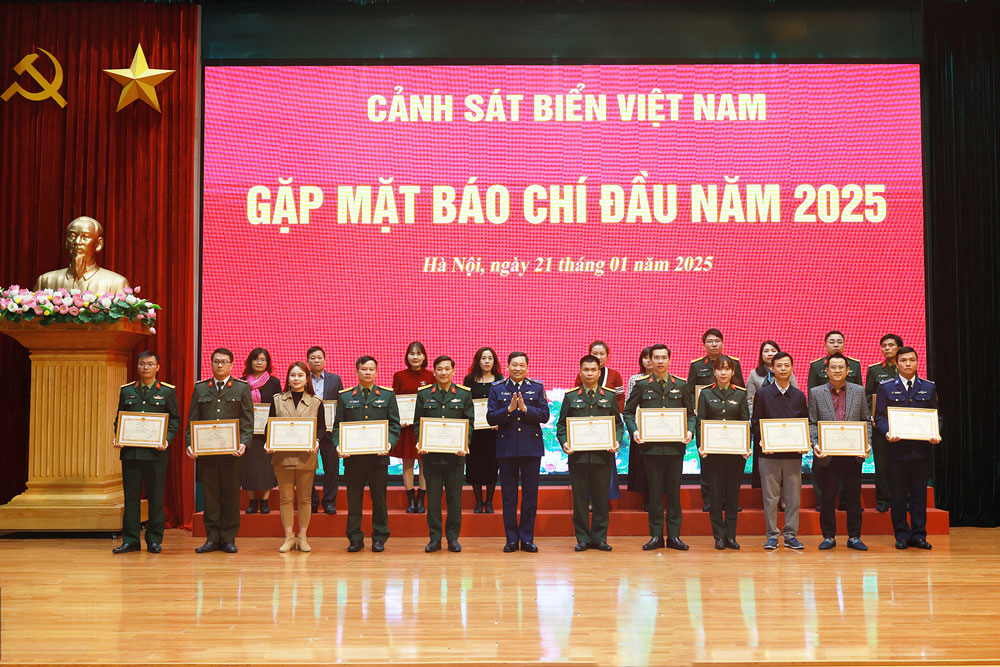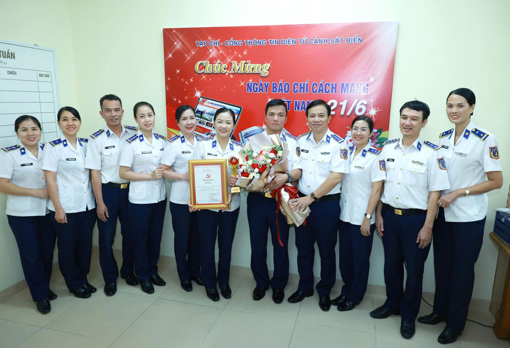 Thượng úy QNCN Nguyễn Bá Thanh (ngoài cùng bên phải) vinh dự được nhận Bằng khen của Cảnh sát biển Việt Nam vì đã có thành tích xuất sắc trong công tác tuyên truyền biển, đảo và Lực lượng Cảnh sát biển Việt Nam năm 2024.