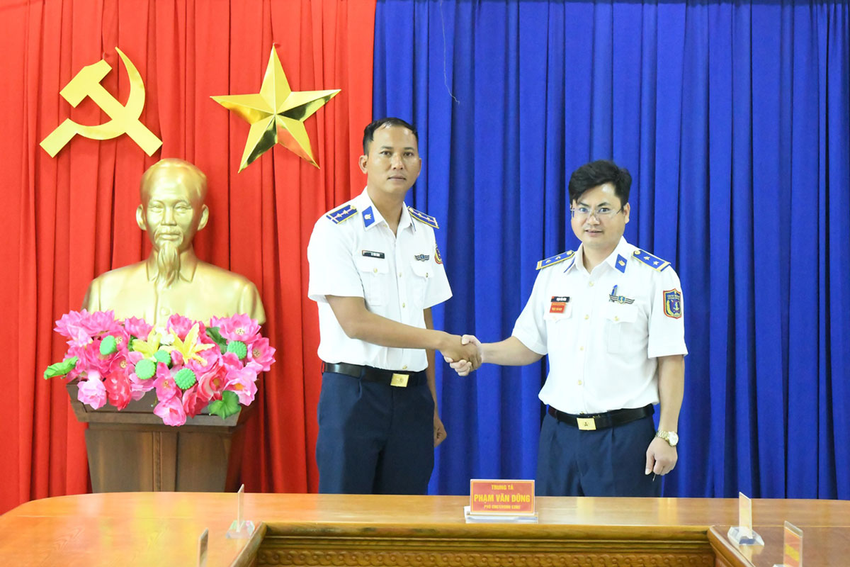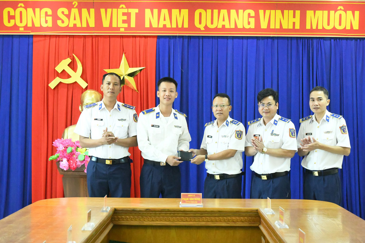 Trung tá Phạm Văn Dũng - Phó Chủ nhiệm Chính trị Bộ Tư lệnh Vùng Cảnh sát biển 2 biểu dương Trung úy CN Lê Văn Nam vì đã có hành động cao đẹp, nhặt được của rơi, trả lại người đánh mất.