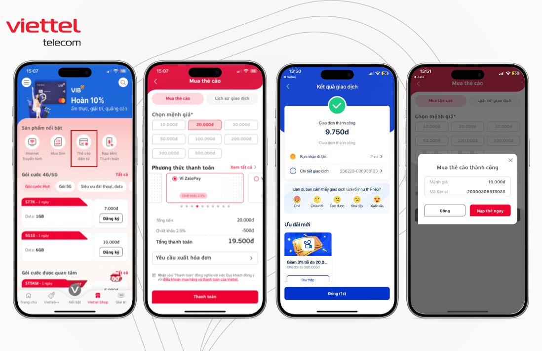 - Ưu đãi hấp dẫn như giảm 50% giá trị thẻ nạp vào Chủ Nhật (áp dụng cho lần đầu tiên mua thẻ cào điện tử), giảm ngay 2.5% cho tất cả giao dịch Mua thẻ cào và Nạp tiền/Thanh toán, áp thêm mã My Viettel voucher và rất nhiều chương trình hấp dẫn khác.