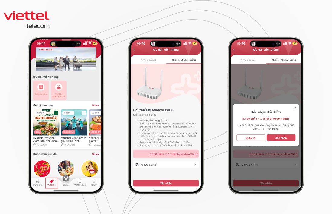 Chỉ với 5.000 điểm Viettel++, Quý khách hàng đã có thể đổi ngay Modem Wifi 6 hiện đại bậc nhất. Số lượng có hạn, truy cập ứng dụng My Viettel để đổi điểm nhận quà ngay hôm nay!