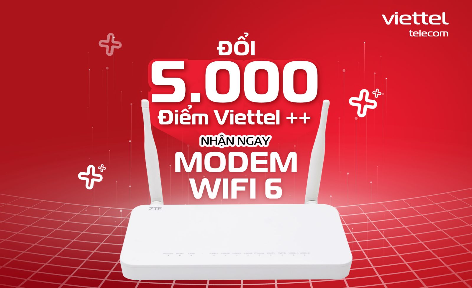 Với mong muốn mang đến cho khách hàng những giá trị thiết thực nhất, Viettel chính thức triển khai Chương trình “Đổi 5.000 điểm Viettel++ nhận ngay Modem Wifi 6”. Chương trình như lời tri ân, đồng thời hỗ trợ Quý khách hàng tiếp cận công nghệ Wifi 6 hiện đại mà không phát sinh thêm chi phí.