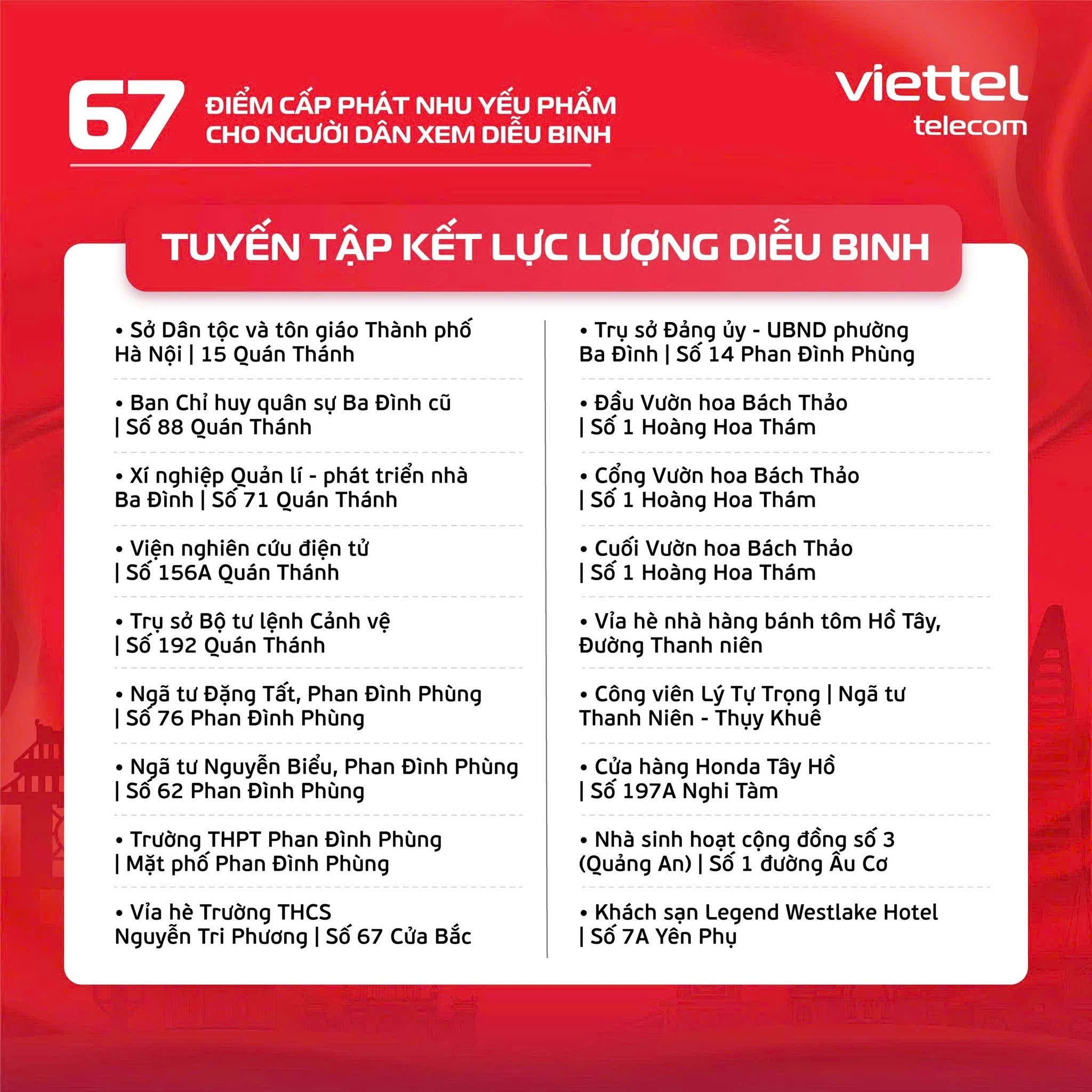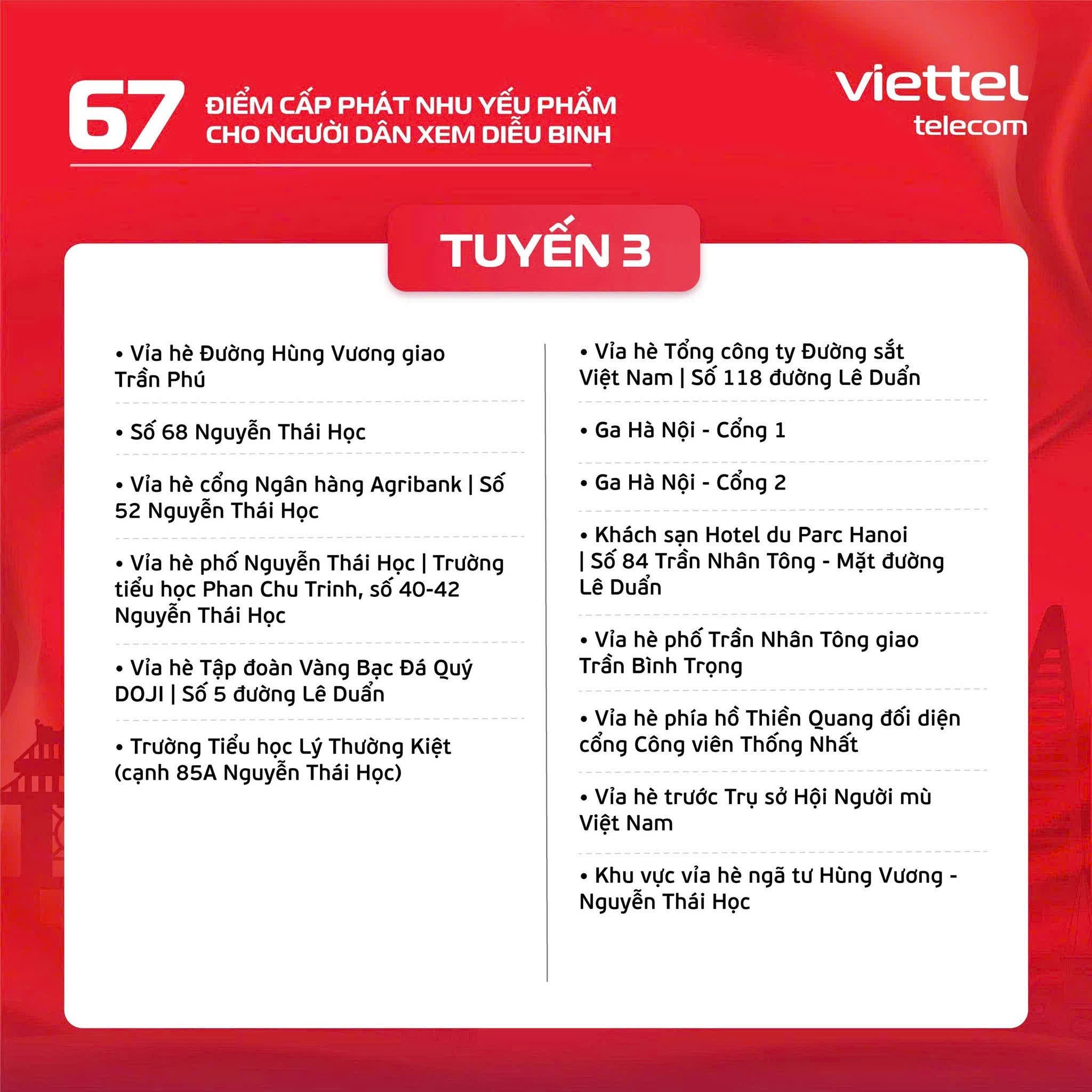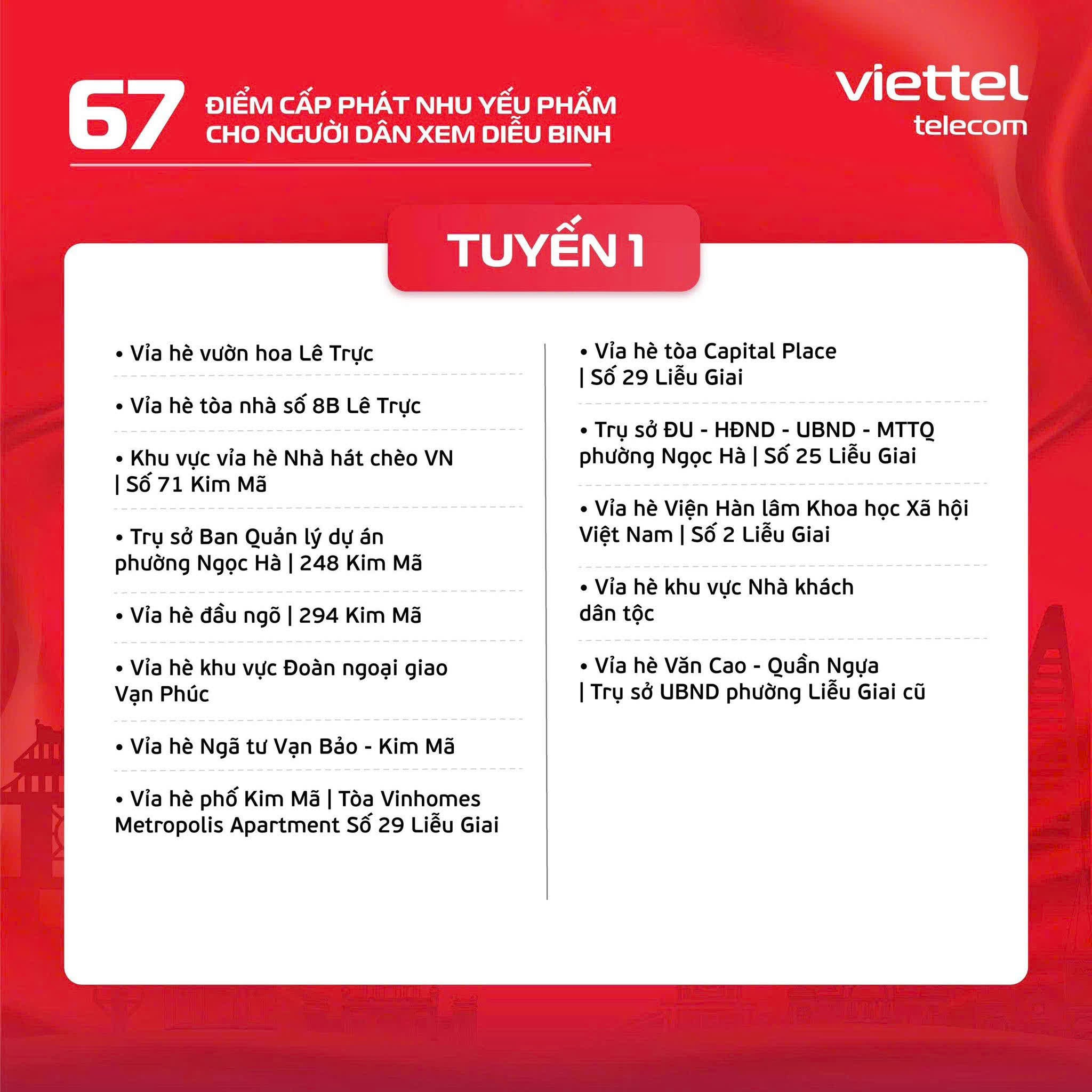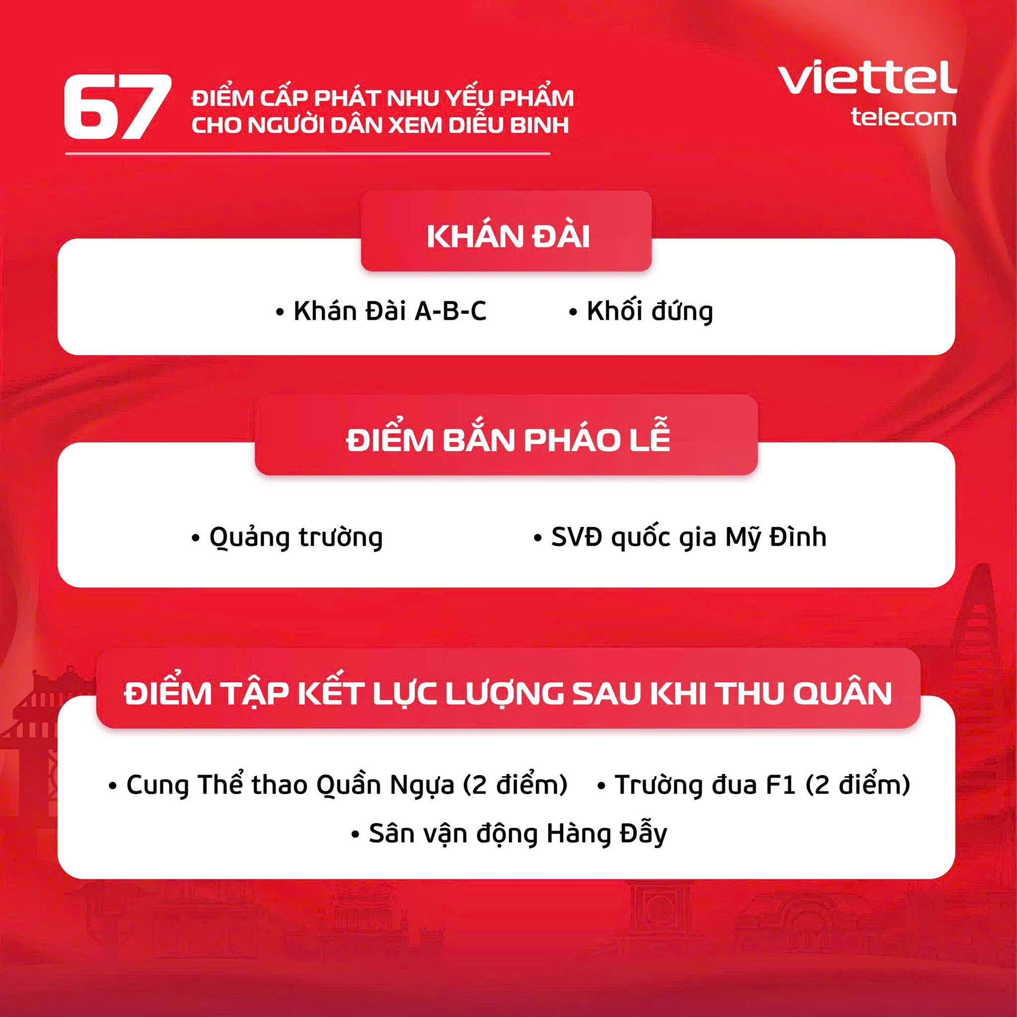 Ngoài việc phối hợp cùng Đoàn Thanh niên Thành phố Hà Nội triển khai 15/67 điểm cấp phát nhu yếu phẩm miễn phí, dịp Quốc khánh 2/9, Viettel còn dành tặng người dân và du khách 80 triệu ưu đãi trong chương trình “Kết nối trọn niềm vui - Mừng 2/9”. Các ưu đãi nổi bật gồm: gói cước 5G29 với data gấp đôi và miễn phí xem phim lịch sử, giảm 29% giá trị thẻ nạp trong ngày 2/9, khuyến mại cho dịch vụ Internet cố định, tặng 80.000 điểm Viettel++ để đổi data, phút gọi và voucher mua sắm, cùng chương trình tìm hiểu lịch sử trực tuyến với tổng giá trị quà tặng hơn 13 tỷ đồng.