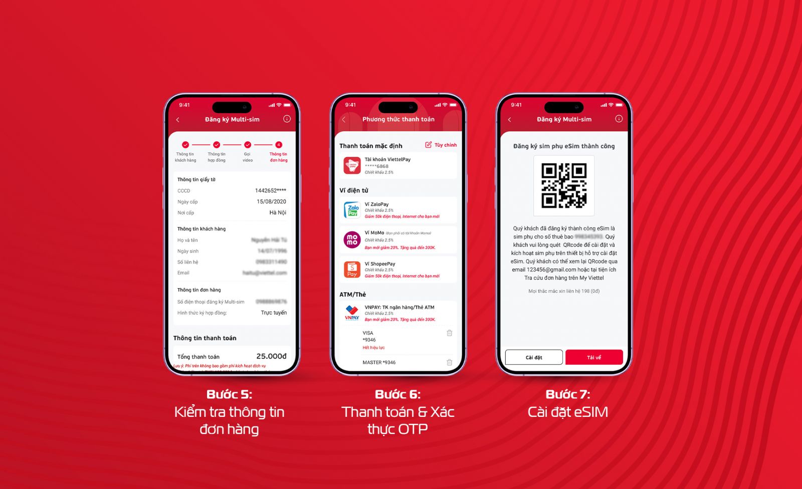 Bước 7: Cài đặt eSIM: Nhận thông báo và QR code eSIM > Quét QR code để cài đặt eSIM trên thiết bị.