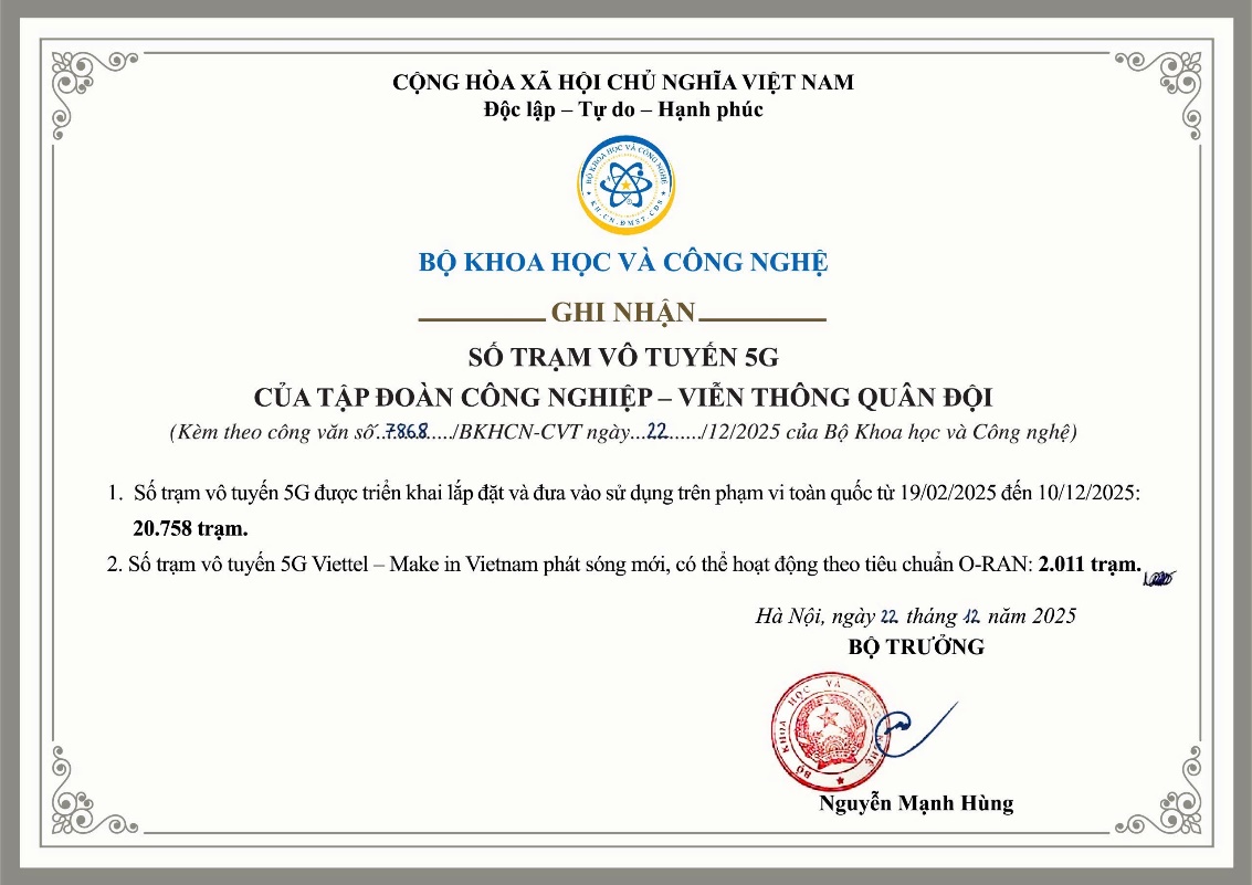 Ngày 25/12/2025, Tổng Công ty Viễn thông Viettel cho biết Bộ Khoa học và Công nghệ đã ban hành văn bản số 7868/BKHCN-CVT ghi nhận kết quả triển khai hạ tầng mạng viễn thông di động 5G của Viettel. Theo đó, Viettel đã lắp đặt và đưa vào sử dụng 22.758 trạm 5G, vượt mức cam kết tối thiểu 20.000 trạm với Chính phủ.