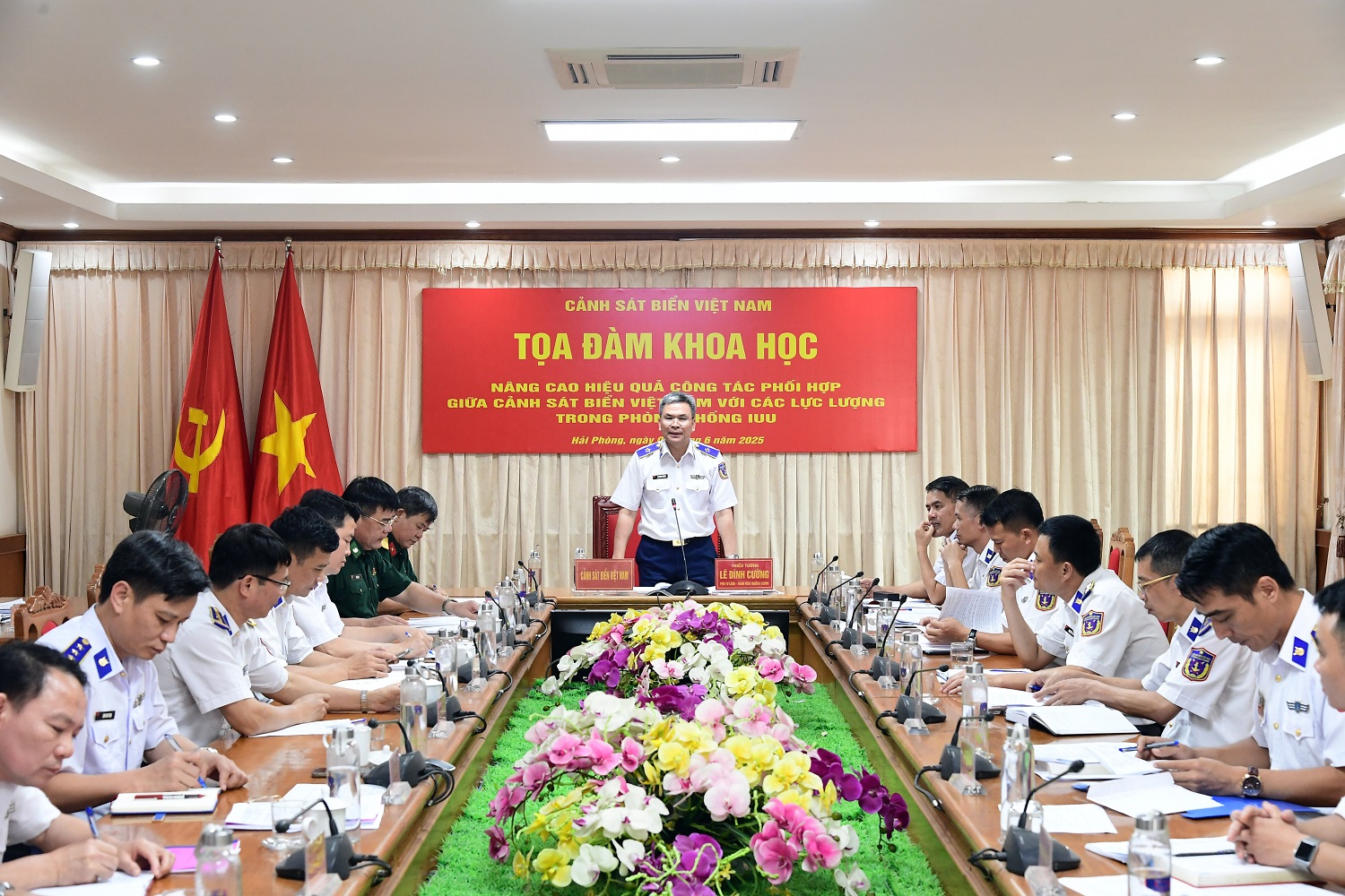 Chiều 3/6, tại thành phố Hải Phòng, Cảnh sát biển Việt Nam tổ chức Tọa đàm khoa học với chủ đề “Nâng cao hiệu quả công tác phối hợp giữa Cảnh sát biển Việt Nam với các lực lượng trong phòng, chống IUU”. Thiếu tướng Lê Đình Cường - Phó Tư lệnh, Tham mưu trưởng Cảnh sát biển Việt Nam chủ trì Tọa đàm.