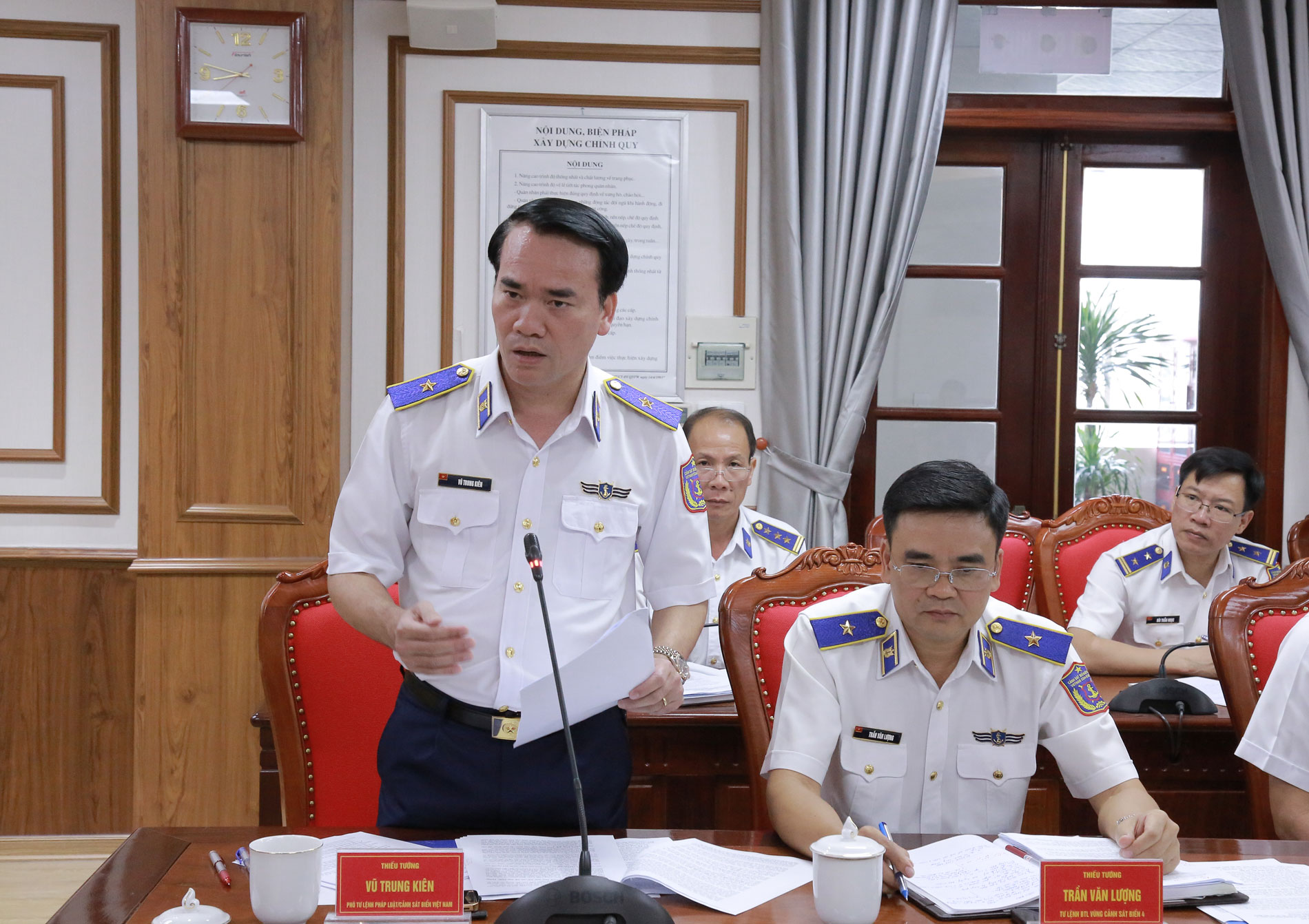 Thiếu tướng Vũ Trung Kiên - Phó Tư lệnh Pháp luật Cảnh sát biển Việt Nam phát biểu tại buổi làm việc.