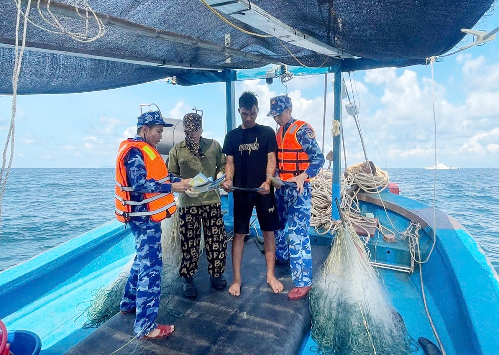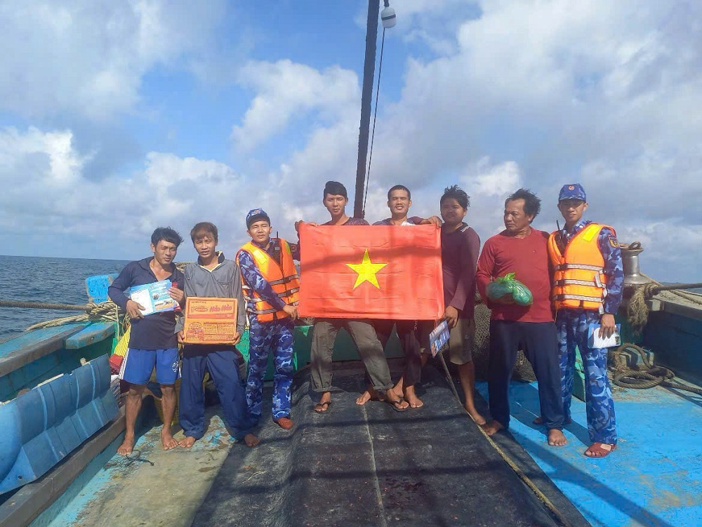 Trên các tàu cá, lực lượng chức năng tiến hành kiểm tra giấy phép khai thác thủy sản, thiết bị giám sát hành trình, nhật ký khai thác, việc chấp hành quy định về vùng biển hoạt động và truy xuất nguồn gốc hải sản,... Qua kiểm tra đã kịp thời phát hiện, nhắc nhở và xử lý nghiêm các trường hợp vi phạm theo quy định của pháp luật. Cùng với công tác kiểm tra, xử lý vi phạm, Hải đoàn 11 chú trọng đẩy mạnh tuyên truyền, phổ biến pháp luật về chống khai thác IUU cho ngư dân; đồng thời động viên, thăm hỏi và trao tặng 50 cờ Tổ quốc và các nhu yếu phẩm để ngư dân vui Xuân, đón Tết trên biển.