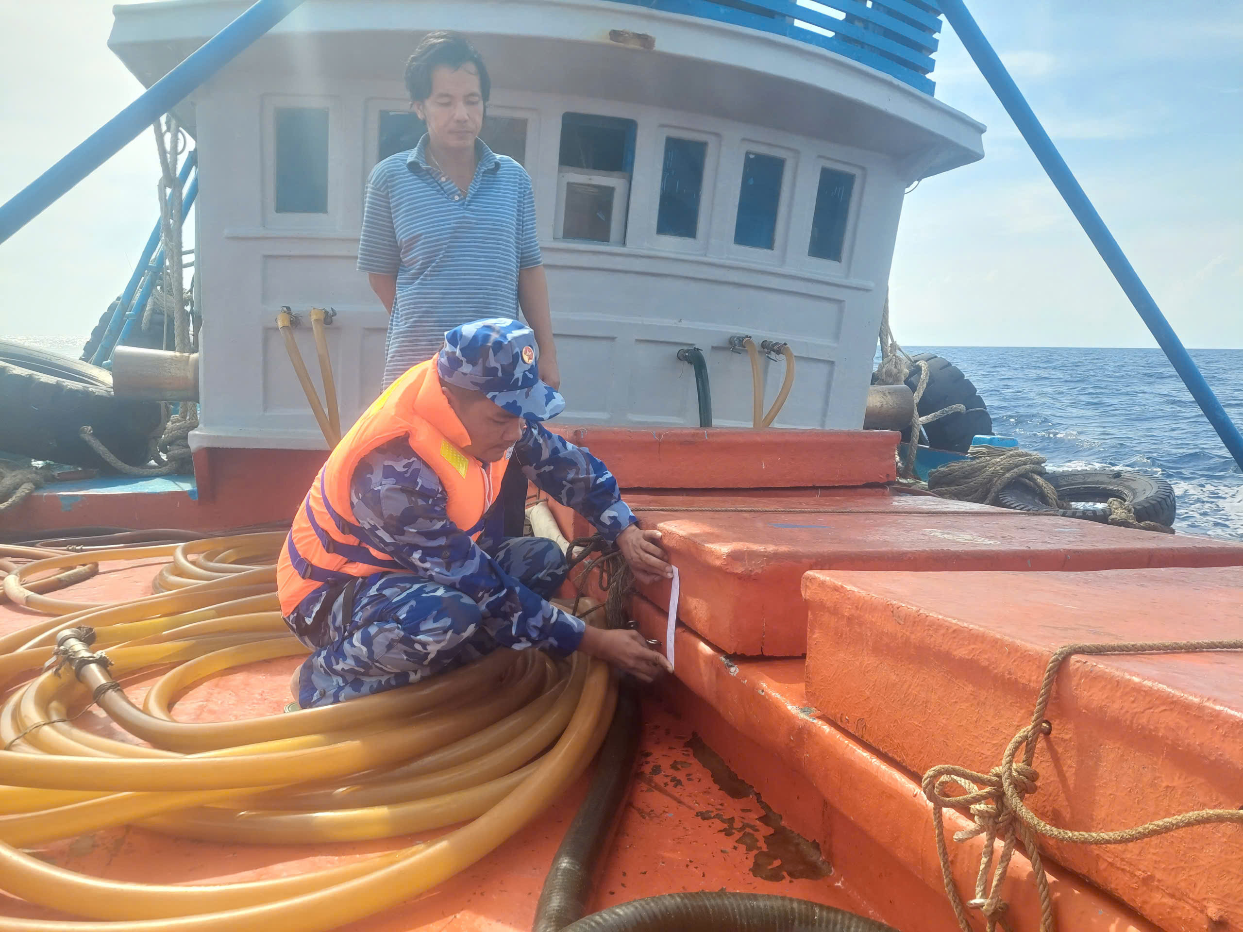 Cụ thể, vào lúc 22h00 ngày 15/9/2025, trong quá trình thực hiện nhiệm vụ tuần tra, kiểm soát trên vùng biển Tây Nam, lực lượng chức năng Hải đoàn 42 đã phát hiện tàu mang số hiệu LA 99095 TS có dấu hiệu vi phạm nên đã tiến hành kiểm tra. Tại thời điểm kiểm tra, trên tàu có 5 thuyền viên, do ông Nguyễn Chí Đức (sinh năm 1981, thường trú tại phường Gò Công, tỉnh Đồng Tháp) làm thuyền trưởng. Theo lời khai ban đầu của thuyền trưởng, tàu đang vận chuyển khoảng hơn 110.000 lít dầu DO nhưng không có hóa đơn, chứng từ chứng minh nguồn gốc hợp pháp.