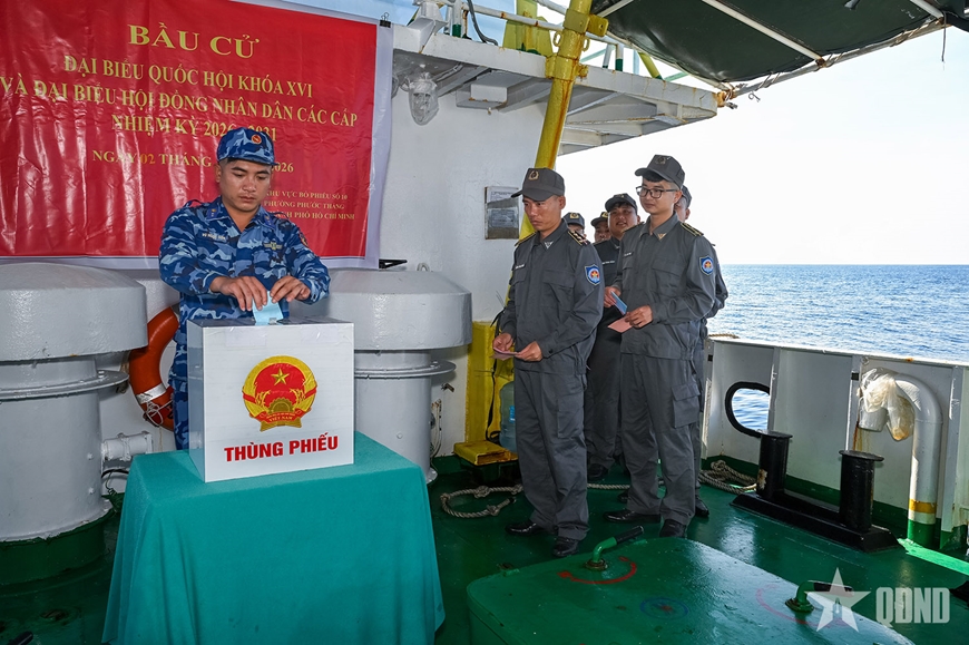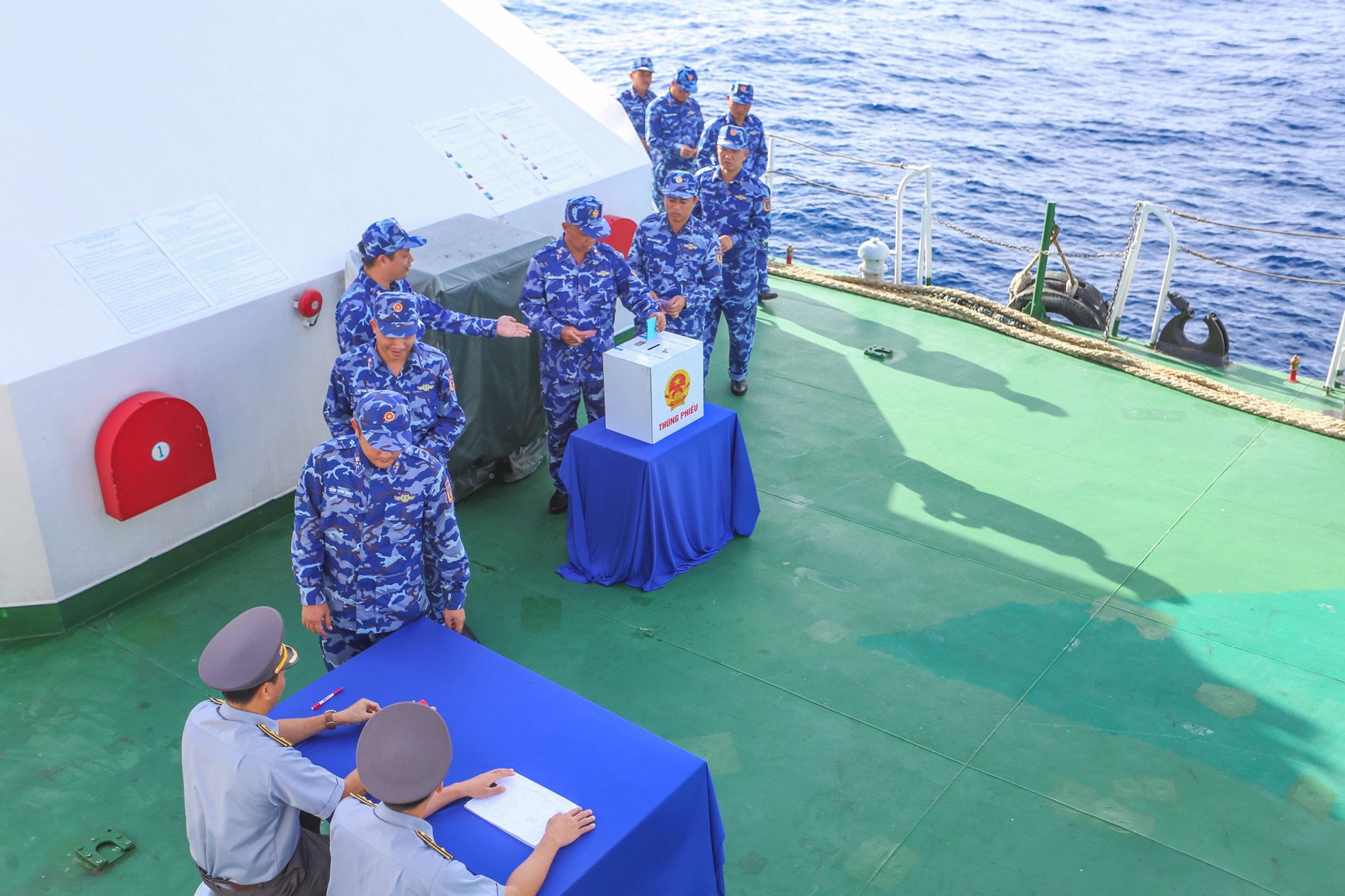 Đối với những người lính giữ biển, quyền công dân luôn gắn liền với những hy sinh thầm lặng. Đó là những ca trực xuyên đêm để bám sát mục tiêu, là những hải trình dài ngày giữa muôn trùng sóng gió. Giữa bao thiếu thốn nơi biển khơi, sự xuất hiện của thùng phiếu bầu cử mang đến cảm xúc đặc biệt. Tại các điểm bỏ phiếu, thùng phiếu được đặt trang trọng, đúng quy định trên boong tàu hoặc trong phòng câu lạc bộ của Tàu. Từng cử tri lần lượt thực hiện quyền và nghĩa vụ công dân, gửi gắm niềm tin và kỳ vọng vào sự phát triển của đất nước.